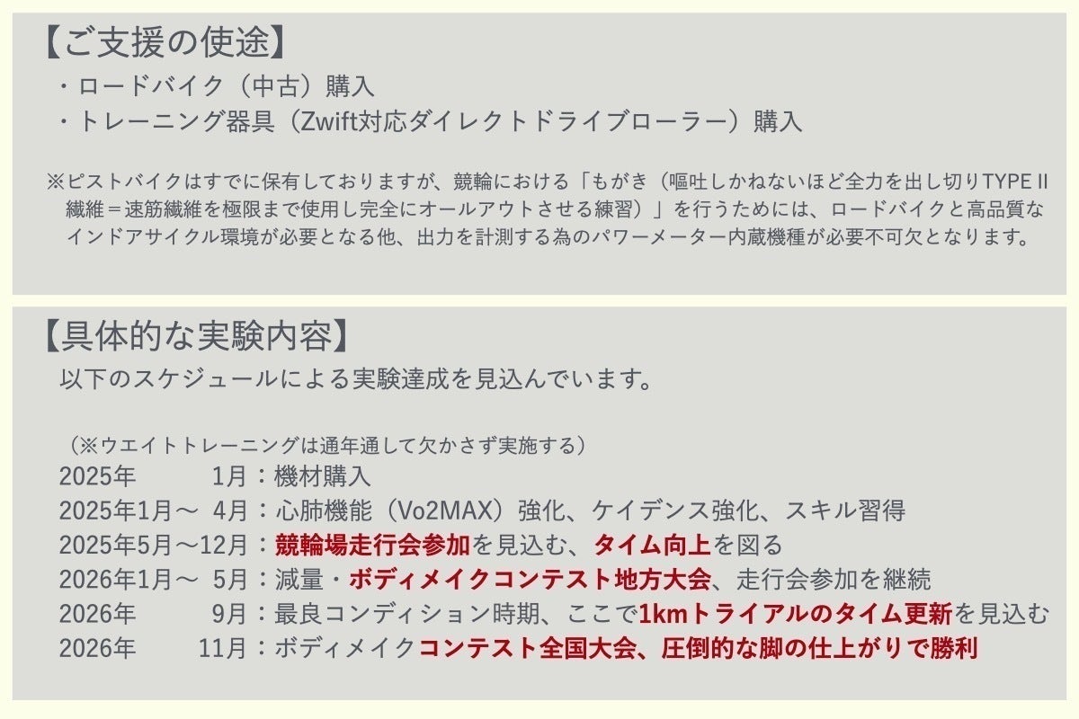 その上で、2025年中に通常の筋トレで全身を強化しつつ、競輪式の自転車トレーニングおよびスプリンターが行う超高重量のウエイトトレーニングを用いて下半身のを変化を観測しつつ本実験の趣旨である爆発的な強化を図ります。