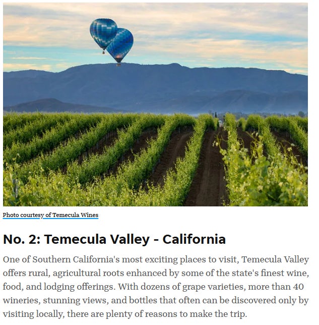 大手ワイン誌の『WINE ENTHUSIAST』がBEST WINE TRAVEL DESTINATION(ベストワイン旅行先)に選出したのが、年間300万人以上が訪れる今注目のワイン産地、南カリフォルニアの テメキュラ (Temecula)。