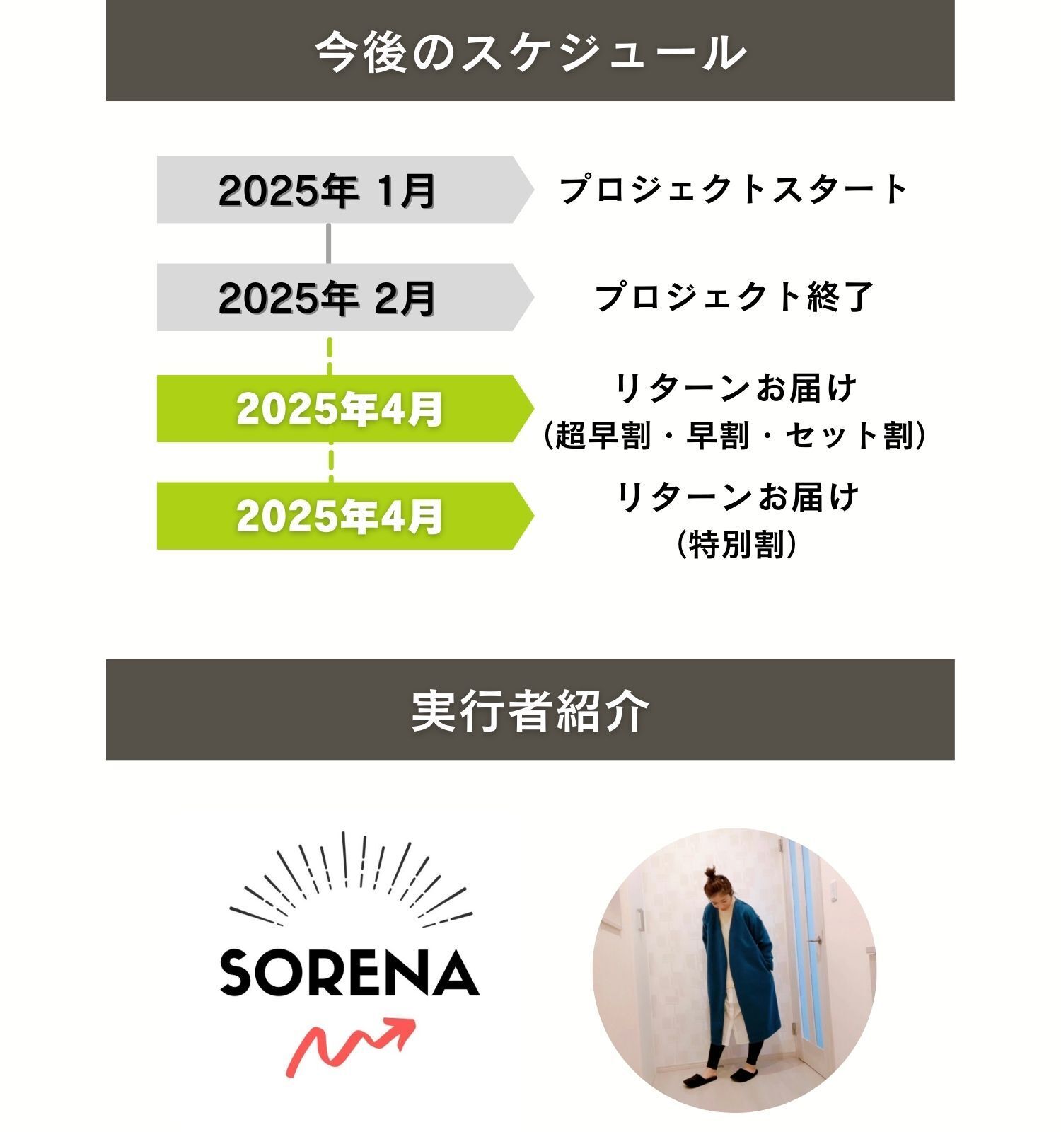 ※本文中に記載させていただいたスケジュールは、あくまでプロジェクト公開時点の予定です。クラウドファンディングの性質上、配送遅延のおそれがございます。原則として、配送遅延に伴うキャンセルはできませんが、リターン配送予定月から6ヶ月を超えた場合には、希望者に限りご対応させていただきます。