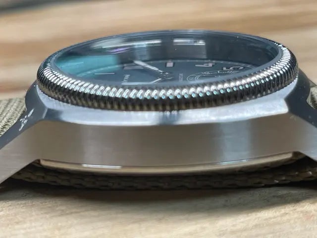 通称マジェティックと呼ばれる、この時計はデザインのバランスが良く特に、コインの縁のようにギザギザとしたベゼルやケースのラグの形状(直線ではなく外側に拡がっている)など、非常に装飾的と言え、本物のパイロットウォッチの圧倒的な存在感を感じる時計と誉の高いデザインなのです。