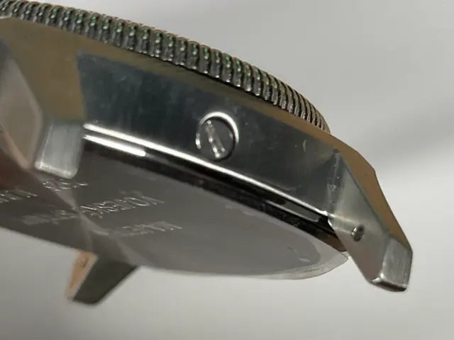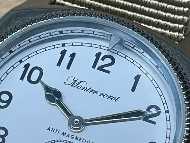 スモールセコンドは、オリジナル同様、文字盤6時側にバランスよく配置されており、視認性は極めて良好です。オリジナルはブラック文字盤に白インデックスでしたが、この文字盤はその色を反転いたしました。文字盤12時側に筆記体で製造者”Montre roroi” モントルロロイのロゴ、そしてスモールセコンドの上に“ANTI-MAGNETIQUE” (耐磁性の意)文字がプリントされている。チェコスロバキア軍に配給していたマジェテックの中でもコインベゼルやコブラ針を採用し、ミリタリーウォッチながら装飾的な要素をふんだんに装備しているのがの”ビックタートル”です。
