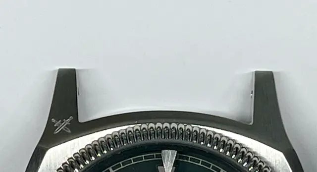このマジェテックには、時計正面11時方向にあるラグには通称『裏剣』と呼ばれる”クロスした2本の剣”が彫り込まれている稀にあります。このマークはイギリス軍のブロードアローと同じく軍所有物の意を表します。諸説ありますが、1940年チェコスロバキアがドイツ軍に占拠されると多くのチェコスロバキア空軍パイロットはイギリスに亡命し、イギリス空軍310飛行機隊を形成して連合軍側としてドイツ軍と戦いました。彼らのモットーは"Fight to rebiuld" "再建の為に戦う”でした。この勇敢な戦いぶりを称えるために、この『裏剣』が時計のラグに彫り込まれたとも言われています。