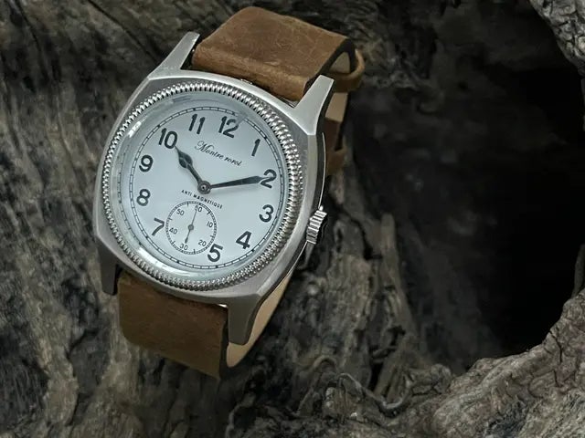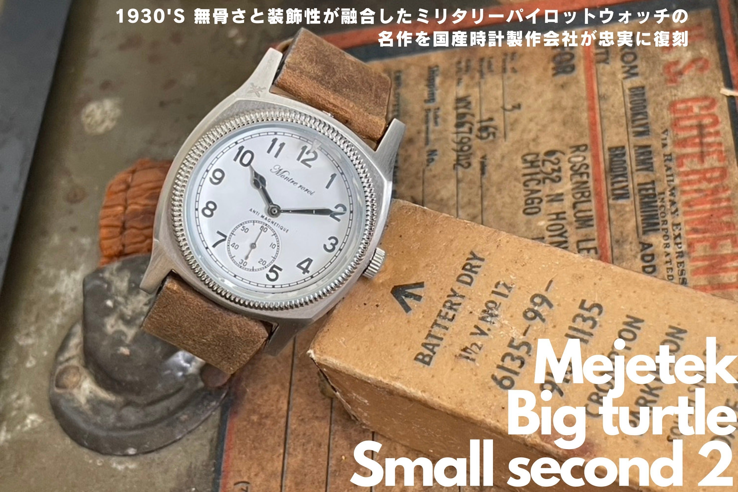 イギリス空軍パイロットに支給された”マーク11"、アメリカ陸軍航空隊に支給された”TYPE A-11"、ドイツ空軍パイロットに支給された”B-UHR"。いずれも屈指の性能を誇る世界のミリタリーウォッチの名作です。これらの時計は当時の大手時計製造会社であるロンジン、エテルナ、レマニアによって製作されました。これらの3大サプライヤーすべてから製作された名作” Majetek マジェテック” を忠実に復刻いたしました。M.R.M.W. 人気の逸品に新たな文字盤を2種リリースいたします。個性的で、優れたデザインとして現代でもとても人気のミリタリーウォッチのマジェテックビックタートルスモールセコンドにカルフォニアダイヤルとホワイトダイヤルを加えました。