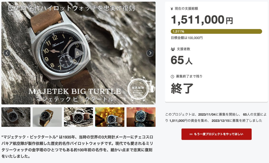2023年11月にCAMPFIREにてMajetek Big turtleの第一弾を実行させていただきました。細部までこだわって復刻させていただき沢山のご賛同をいただきました。以来M.R.M.W.でも1位、2位を争う人気モデルとなりました。これもご支援をいただいた皆様のお陰です。誠に有難うございました。多くの販売店やご購入者様より高度な創りでコストパフォーマンスが高いといううれしいご意見の他、もっと文字盤を選べるようにして欲しいという意見をいただきました。