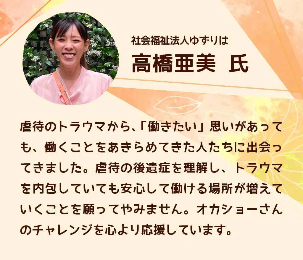 - Spaceship Earth様:虐待サバイバーの後遺症に配慮された社会を目指して展開する「被虐待者の雇用創出」と対・企業の「研修事業」