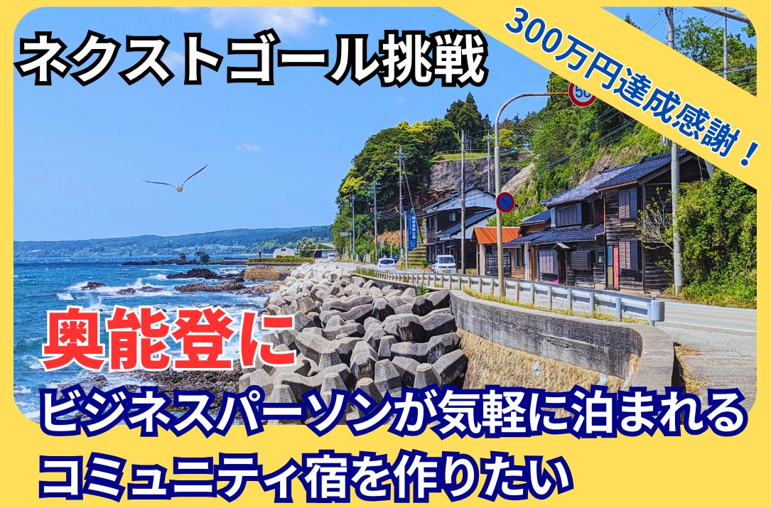 そして、今回達成した場合には、宿泊者専用のカーシェア用の乗り物を購入しようと思います。能登空港でレンタカーを借りなくても、ふるさとタクシー900円で宿まで来ていただければ視察や観光、買い物などに使っていただける乗り物です。