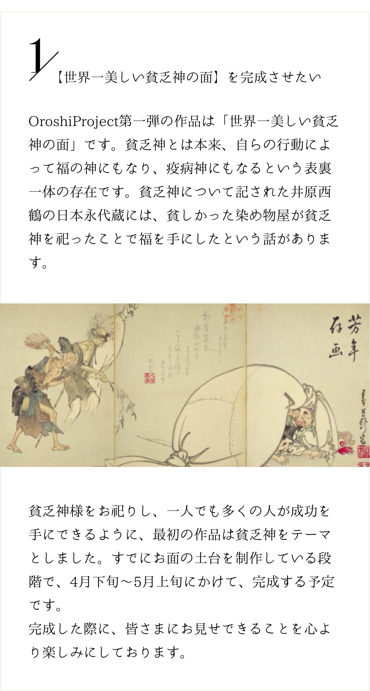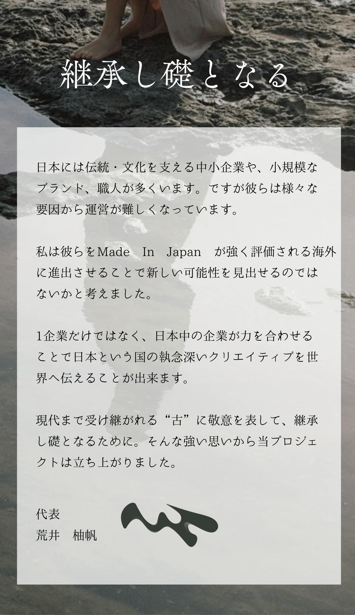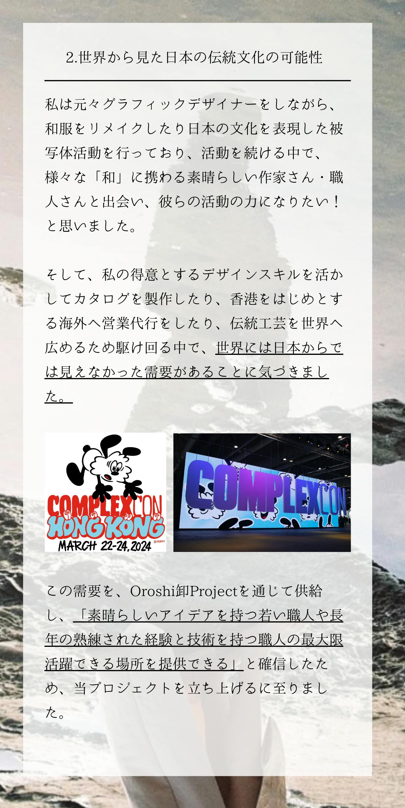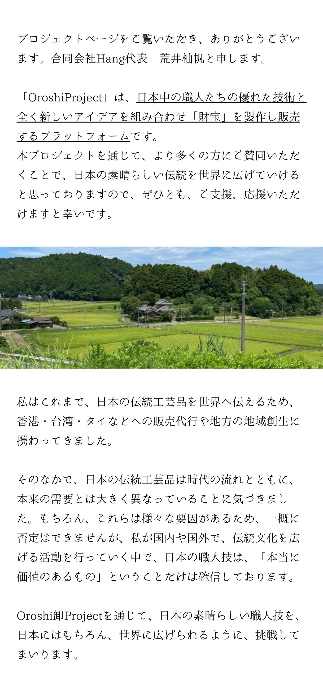 私は、Oroshi卸Projectを通して、日本中の様々な職人たちの力を合わせて作られた「財宝」を販売するブランドを作りたいと考えております。そして、今回のクラウドファンディングでは、以下の3つを実現できるようにプロジェクトに挑戦いたします。