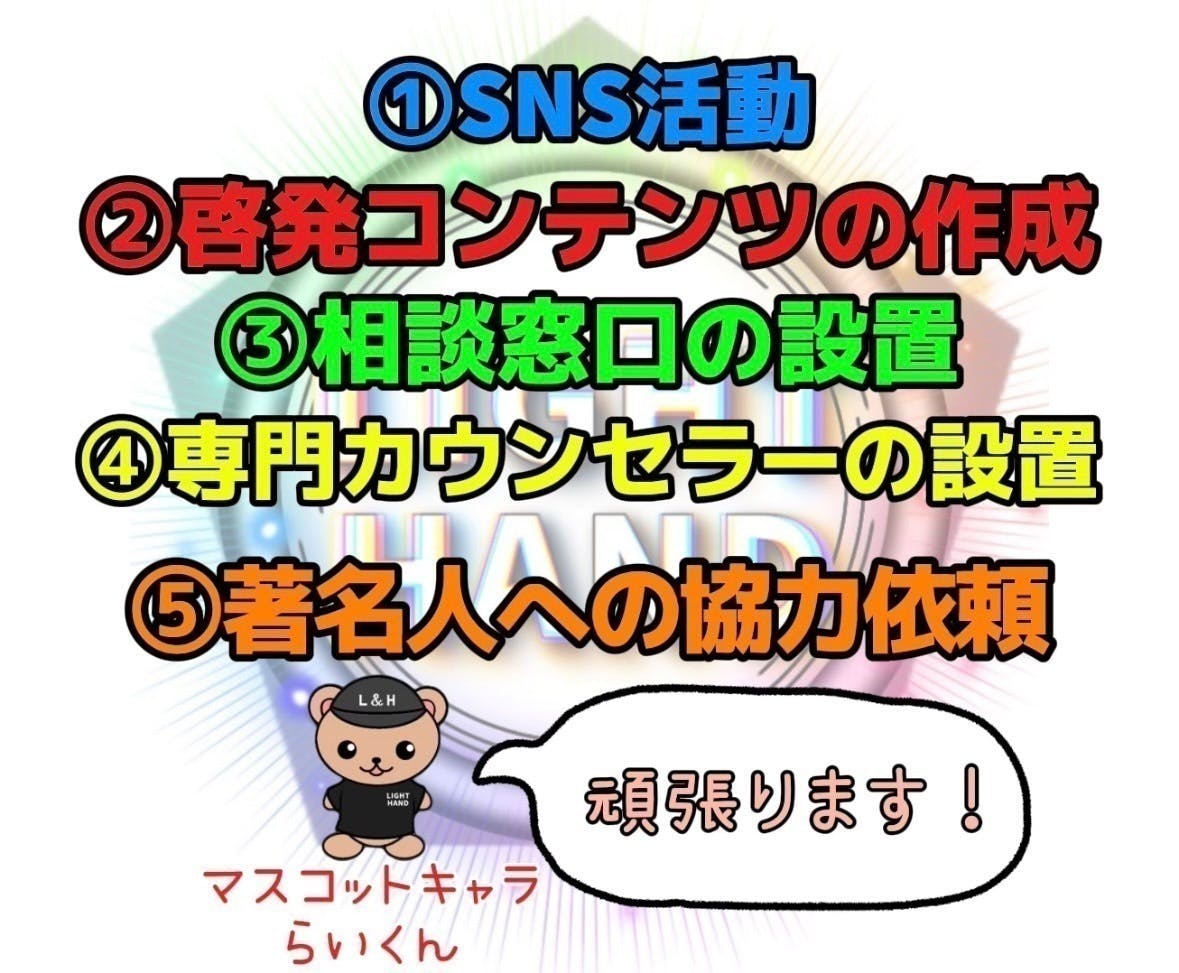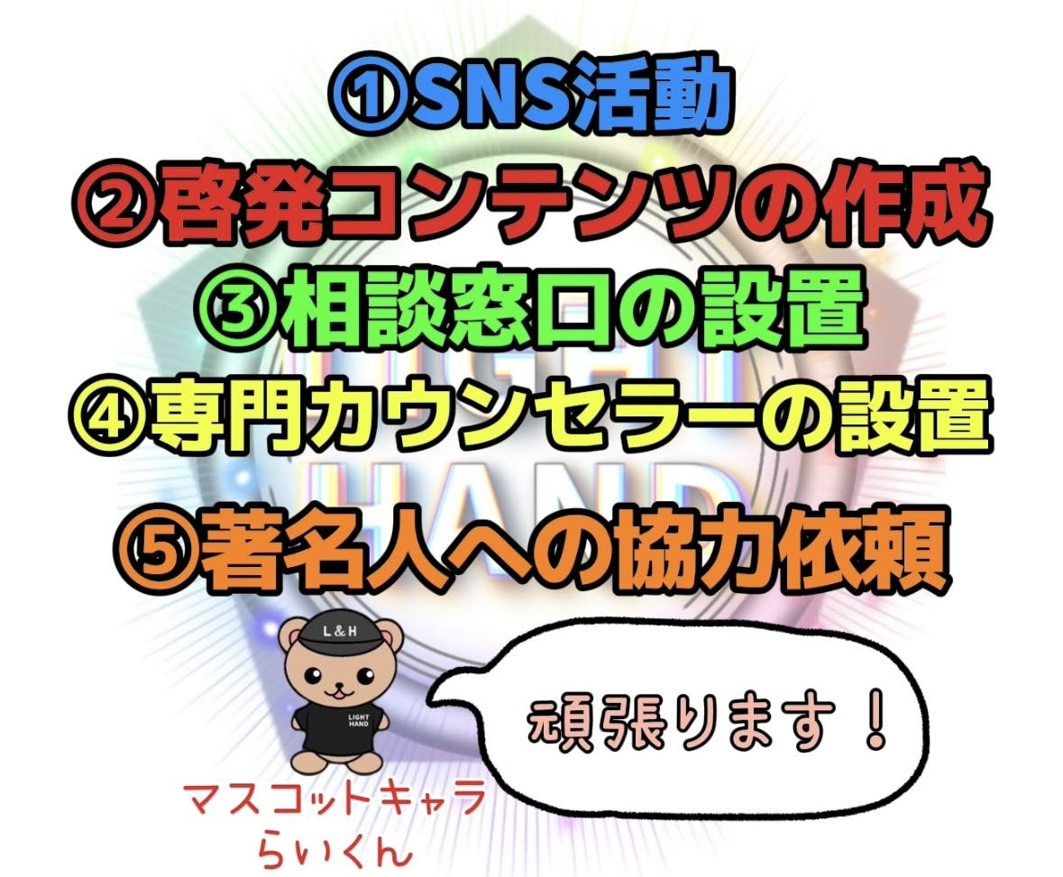 「LIGHT HAND」は、社会の無関心が引き起こす悲劇を食い止めるために設立されました。この活動を通じて、一人でも多くの人が闇バイトの危険性を認識し、社会全体で被害を減らしていくことを目指しています。まだ道半ばではありますが、皆さまのご支援とご協力が、未来への希望を生み出す力となります。どうか、このプロジェクトへのご理解とご協力をお願いいたします。