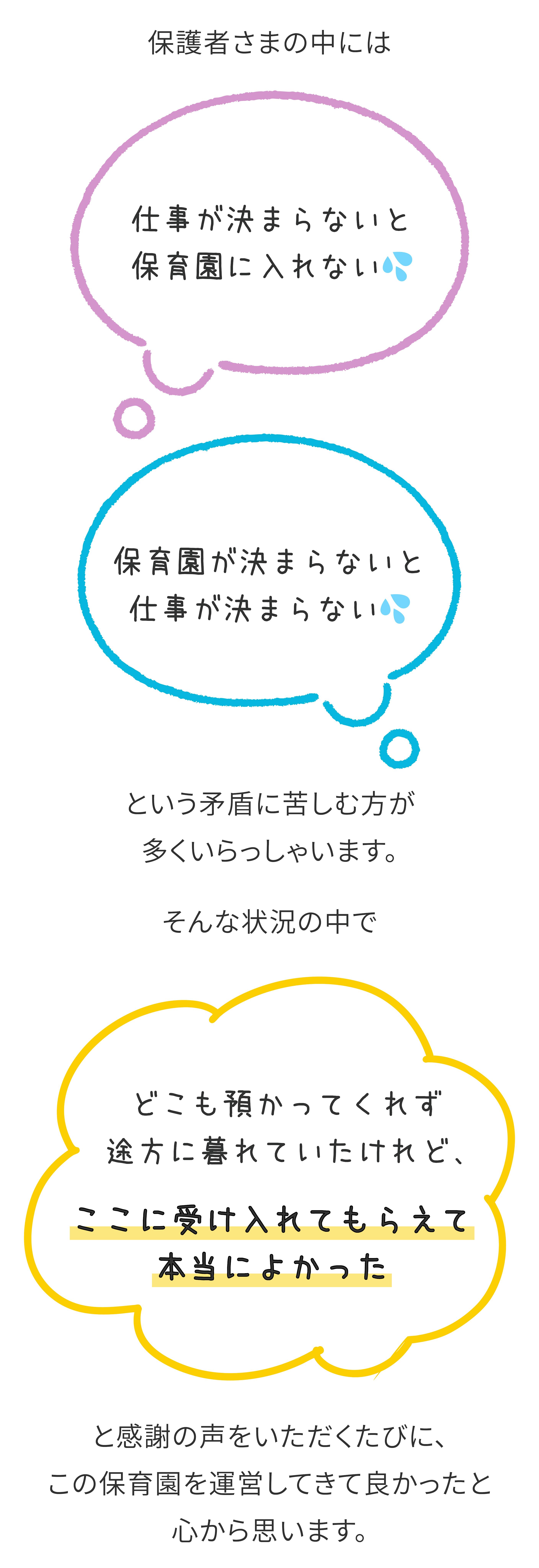 ですので、保育料の返還を信じて当園に通ってくださる保護者の方々に、なんとか約束を果たしたいという思いがあります。