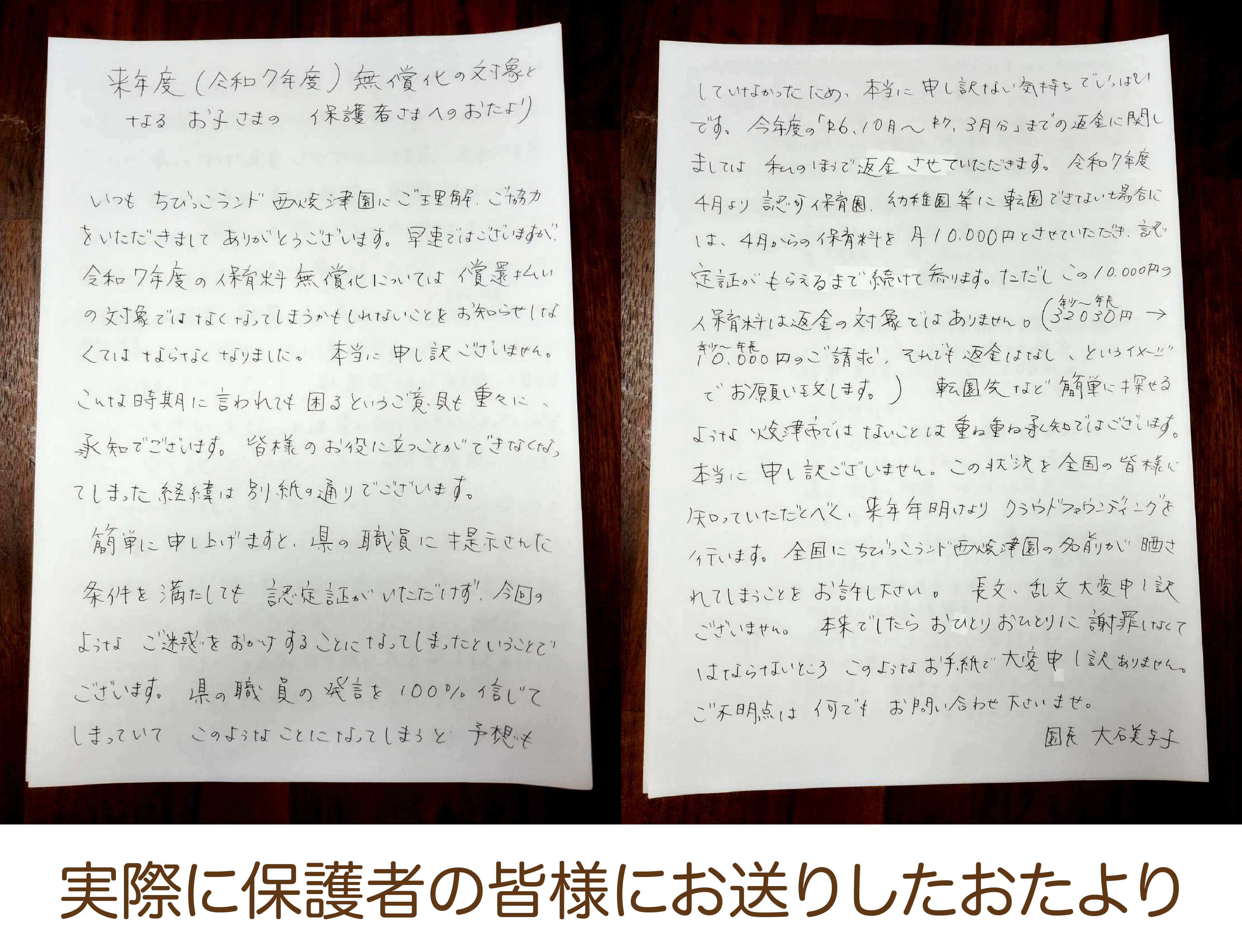 保育料の返還については、身銭を切る覚悟で取り組むつもりですが、もともと運営がギリギリの状況であるため、大変厳しいのが現実です。