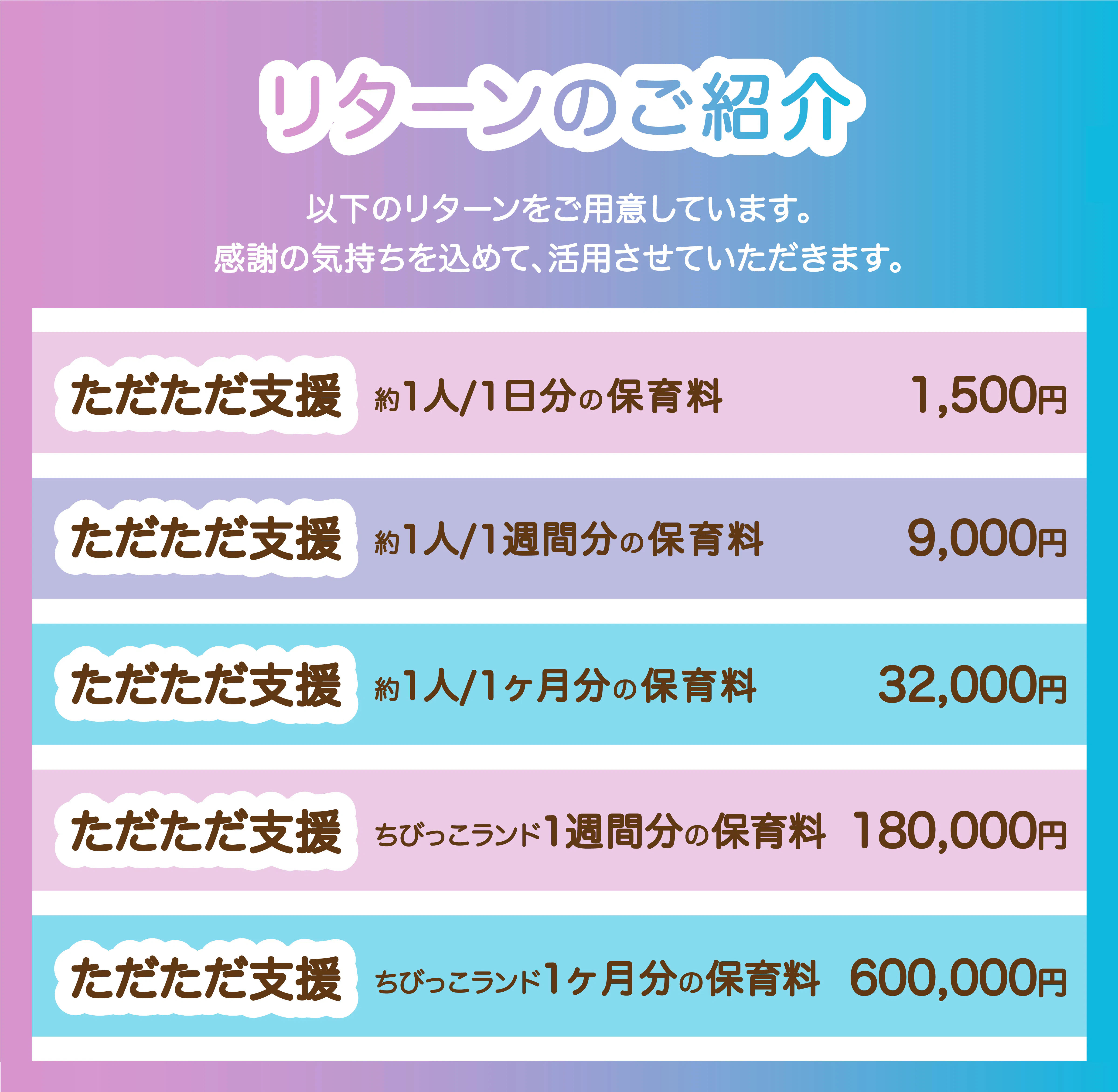 今回のクラウドファンディングでは、保護者の皆さまへの保育料返還を目的として、ご支援をお願いしております。