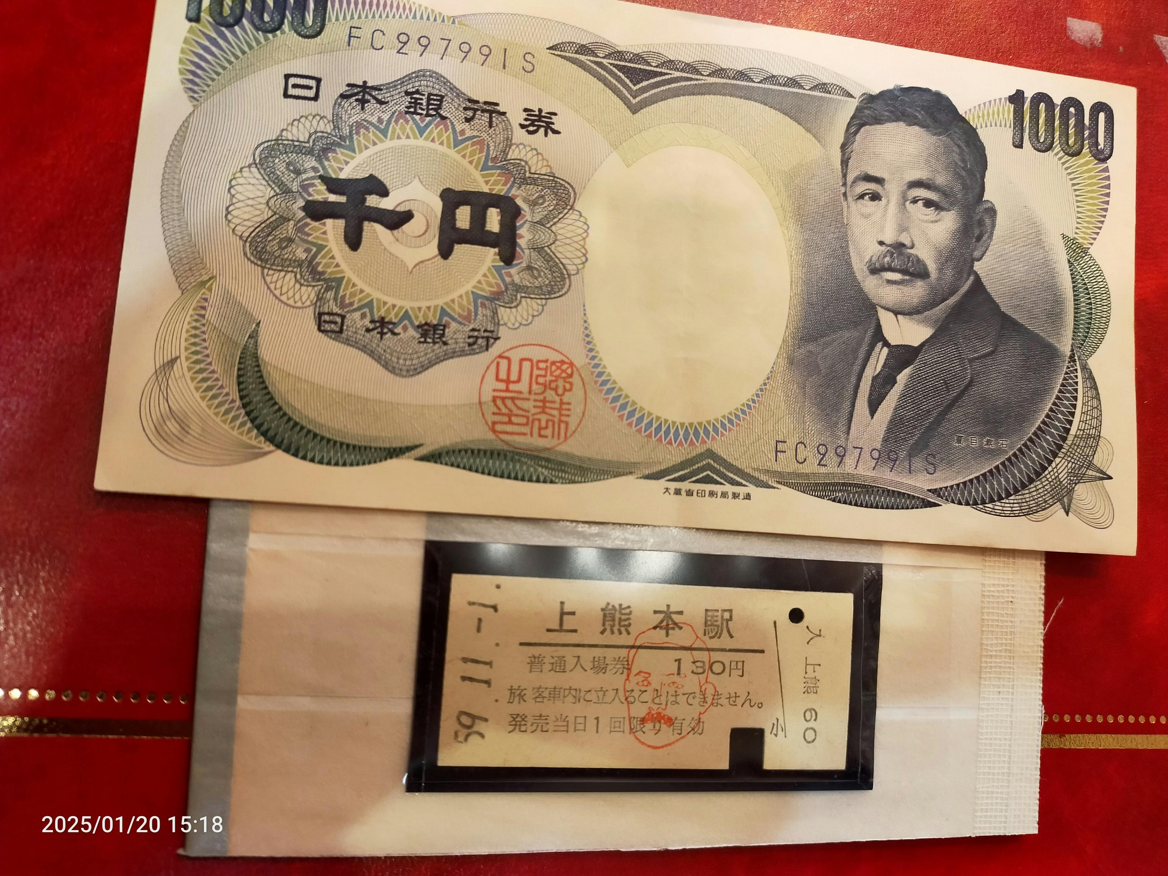 中でも珍しいのは「上熊本駅」発行の夏目漱石記念切符、昭和59年11月1日、40年も前でもはや忘れ去られていますが、実はこの日「夏目漱石の新千円札が発行された日」