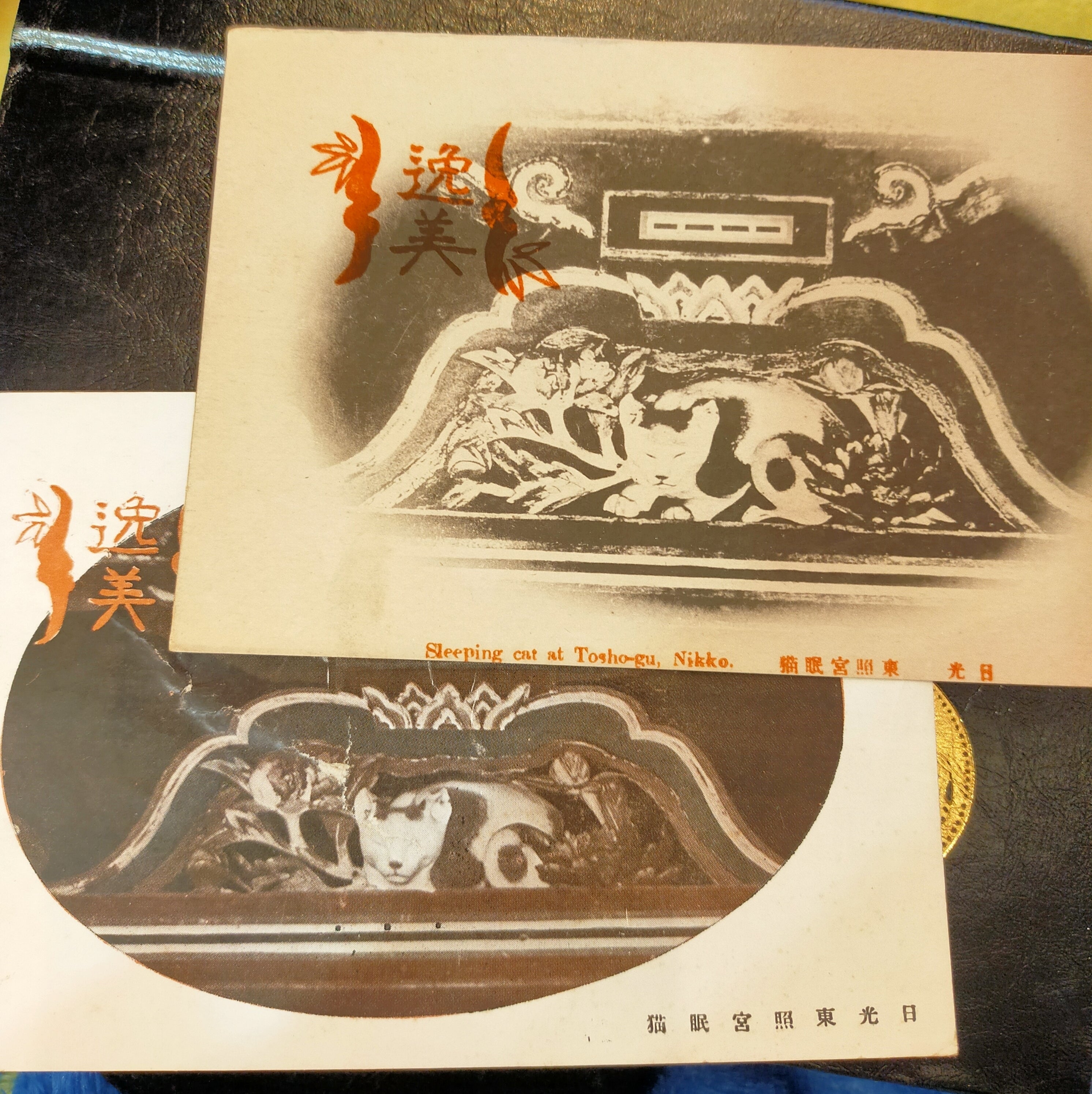 「猫の切手の本」対向の「ねこの郵便局の本」に日光眠り猫絵葉書の貴重なコレクションが公開されます。店主が集めた眠り猫絵葉書は26種。明治時代の白黒写真から手彩色らしきもの、総天然色物まで。眠り猫は数十年に一度塗り替えられます。塗り替えの遍歴もわかる貴重な1冊かもしれません。
