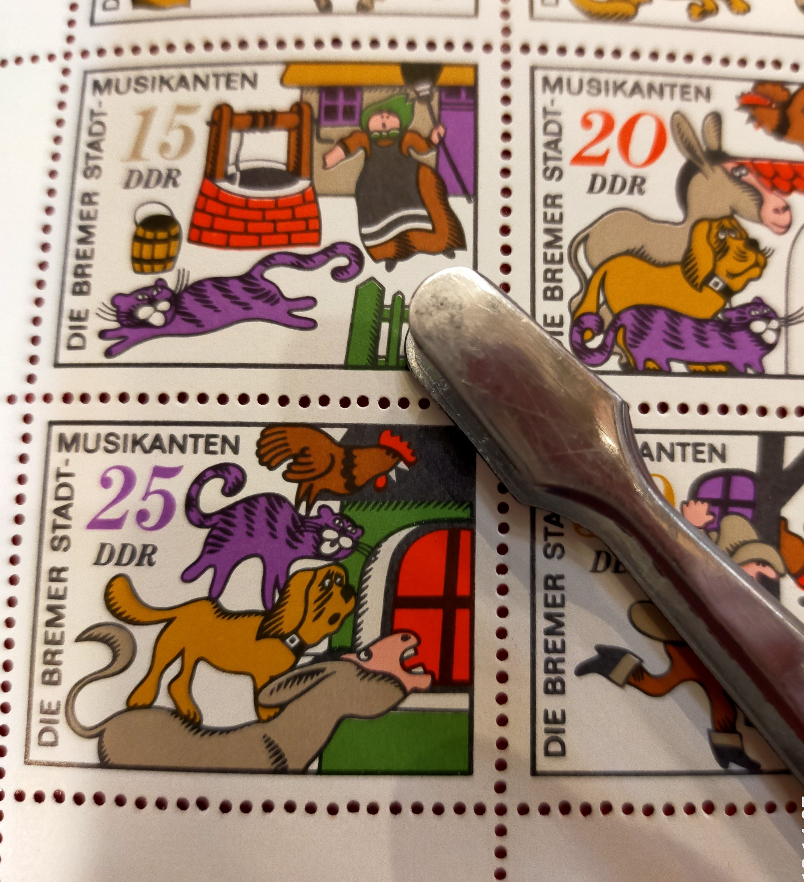 グリム童話の「ブレーメンの音楽隊」の猫の活躍を描いた切手、グリムは書いていませんが、猫がこのチームの隊長だったのではないでしょうか?