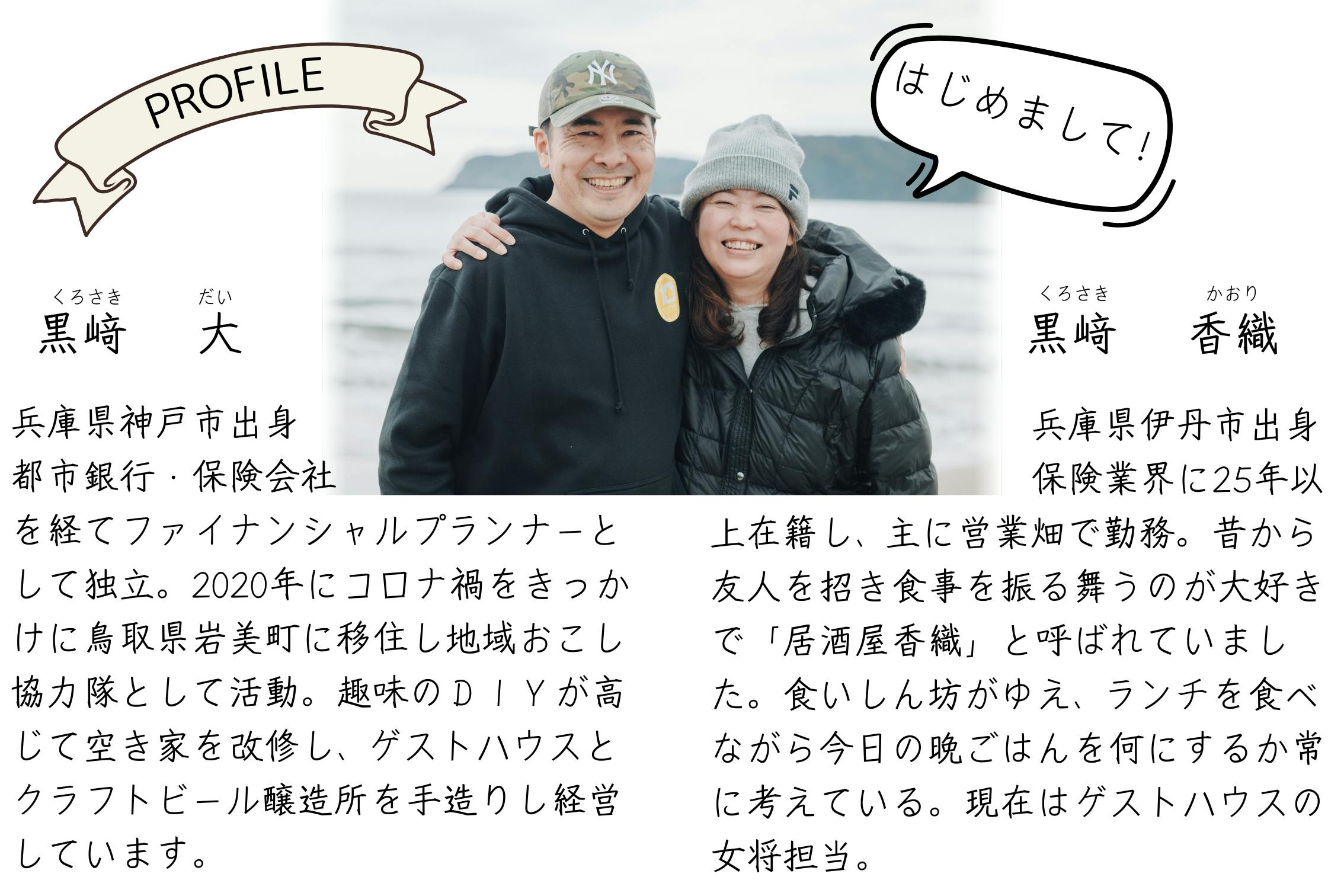 地域おこし協力隊の任期満了に伴い、2階から海が見える昭和レトロな空き家を夫婦2人のセルフリノベーションで再生。現在 1日1組限定のゲストハウスと、自ら酒類製造免許を取得しクラフトビール(IWAMI BLUE BEER)醸造所を営んでおります。