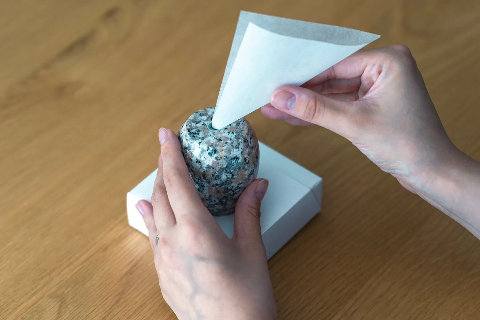 4,同梱の薬包紙を斜めに折り、こぼれないように丁寧にお骨の粉をいれる。