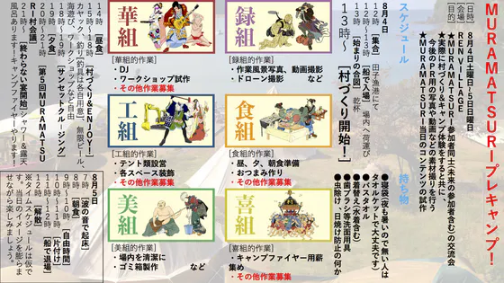 集まった仲間は既にMURAMATSURIの準備を始めていますが、仲間も、アイデアも、材料もまだまだ足りません!