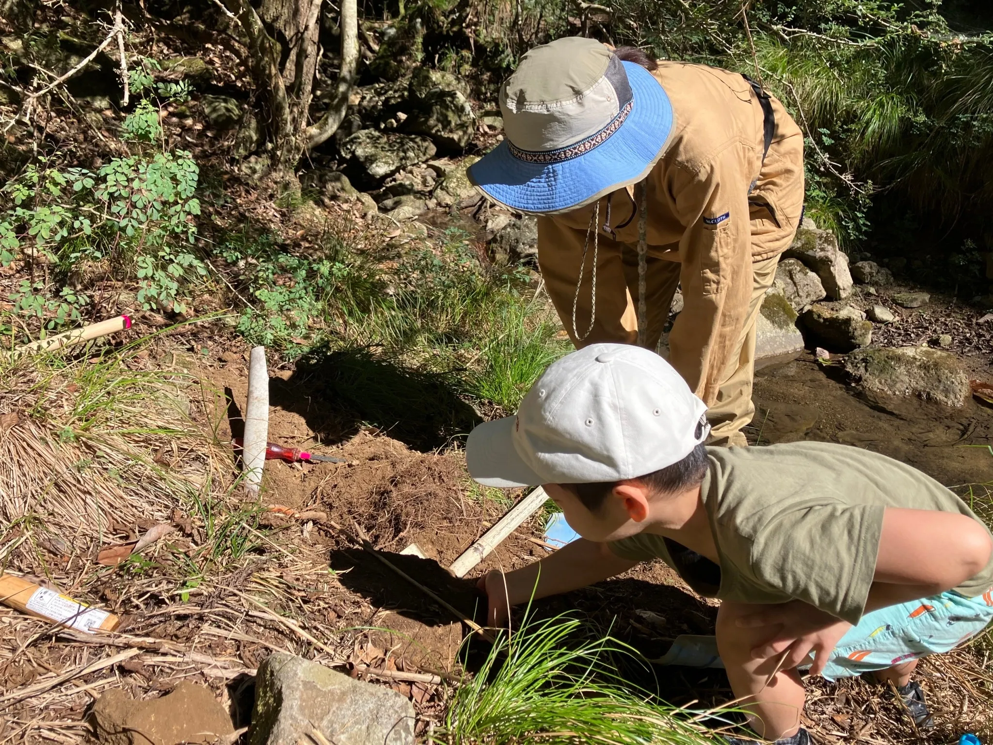 同様に、傾斜地で土を掘る際は「稜線(りょうせん)に沿って掘る」という技術も、雨による土砂崩れを防ぐための大切な知識として、しっかりと心に留めています。