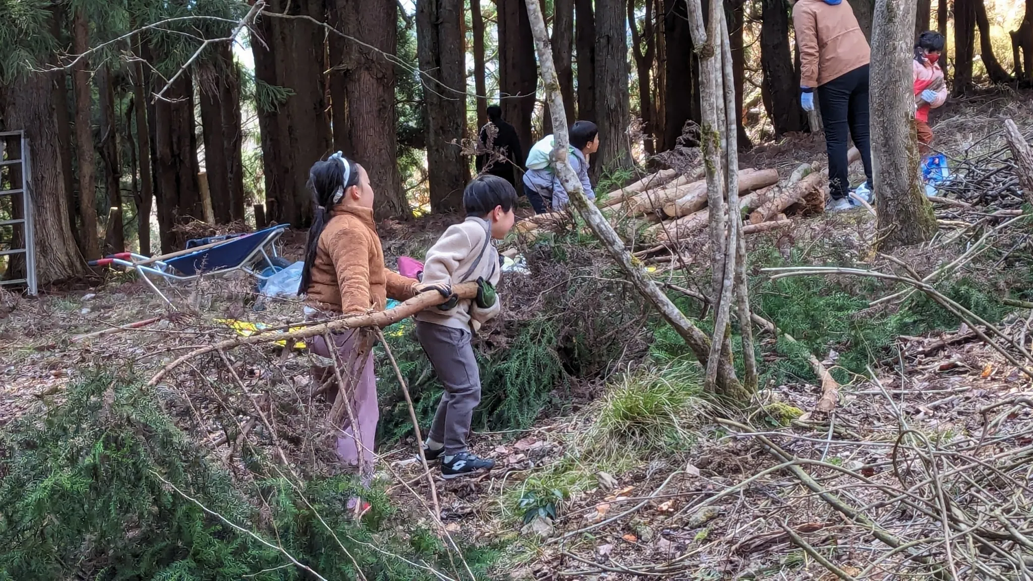 例えば、ある日の活動では、最初は気が進まず車の中でゲームをしていた子どもが、山に入ると表情が一変。落ち葉ステーションづくりでは、竹を切ったり割ったり、柵を作ったりと、最後まで集中して活動を楽しむ姿が見られました。