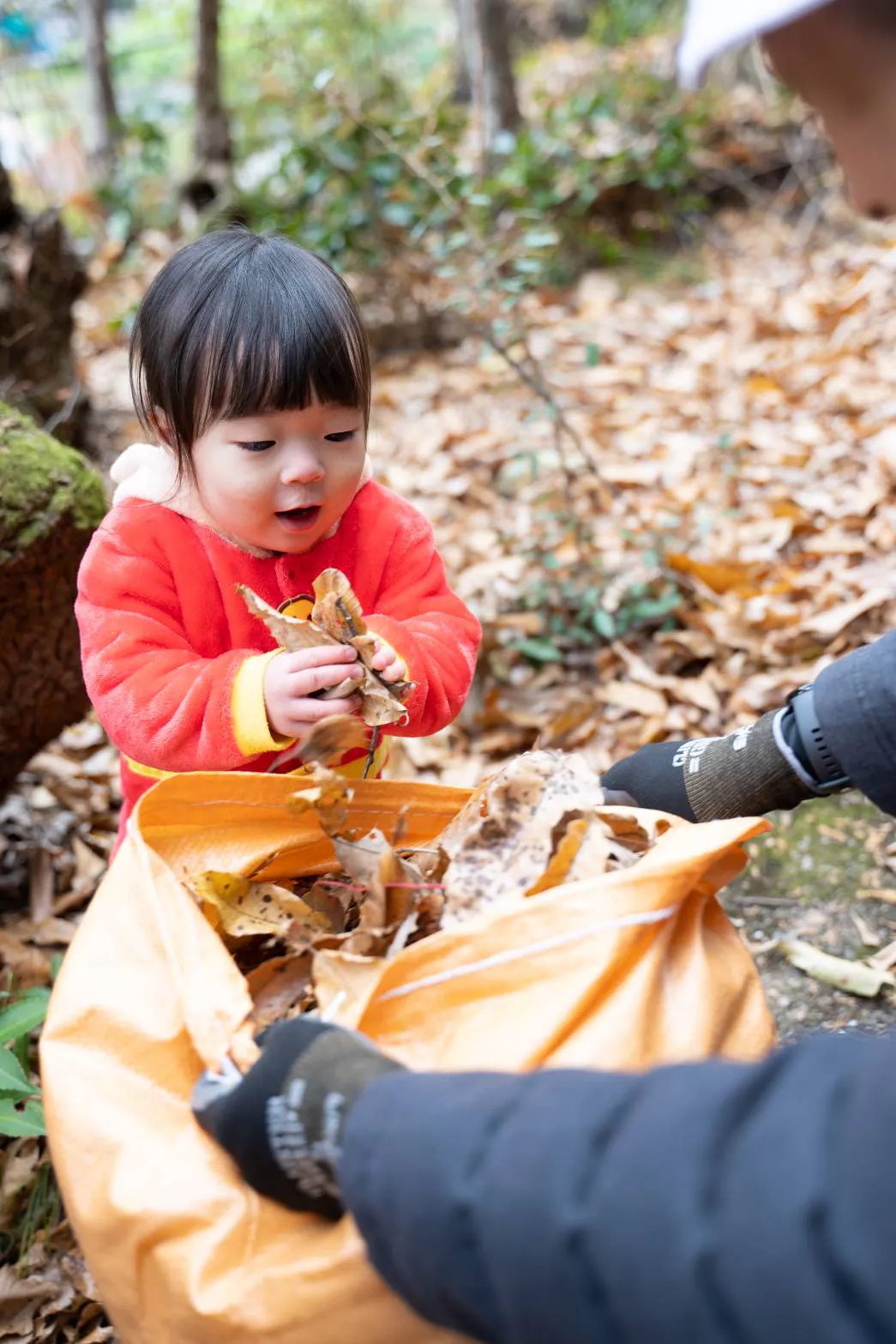 「落ち葉は木の下ではなく、コンクリートの上のものを拾う」という指導に、子どもたちは真剣に耳を傾けます。それは単なるルールではなく、木の下の落ち葉は土に還り、森の栄養になるという生態系の知恵です。