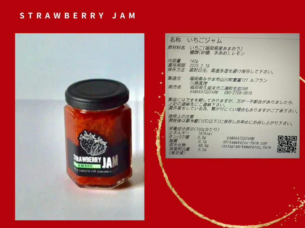 私たちのあまおうは、「ただ食べてもらう」だけでは終わりません。もっと多くの人にその美味しさを伝えるために、加工品作りを始めました。特にジャムの試作には時間をかけ、添加物を使わず、果実そのものの味を生かすレシピを何度も試しました。完成したジャムは、あまおうの芳醇な香りと濃厚な甘みを存分に感じられる一品です。
