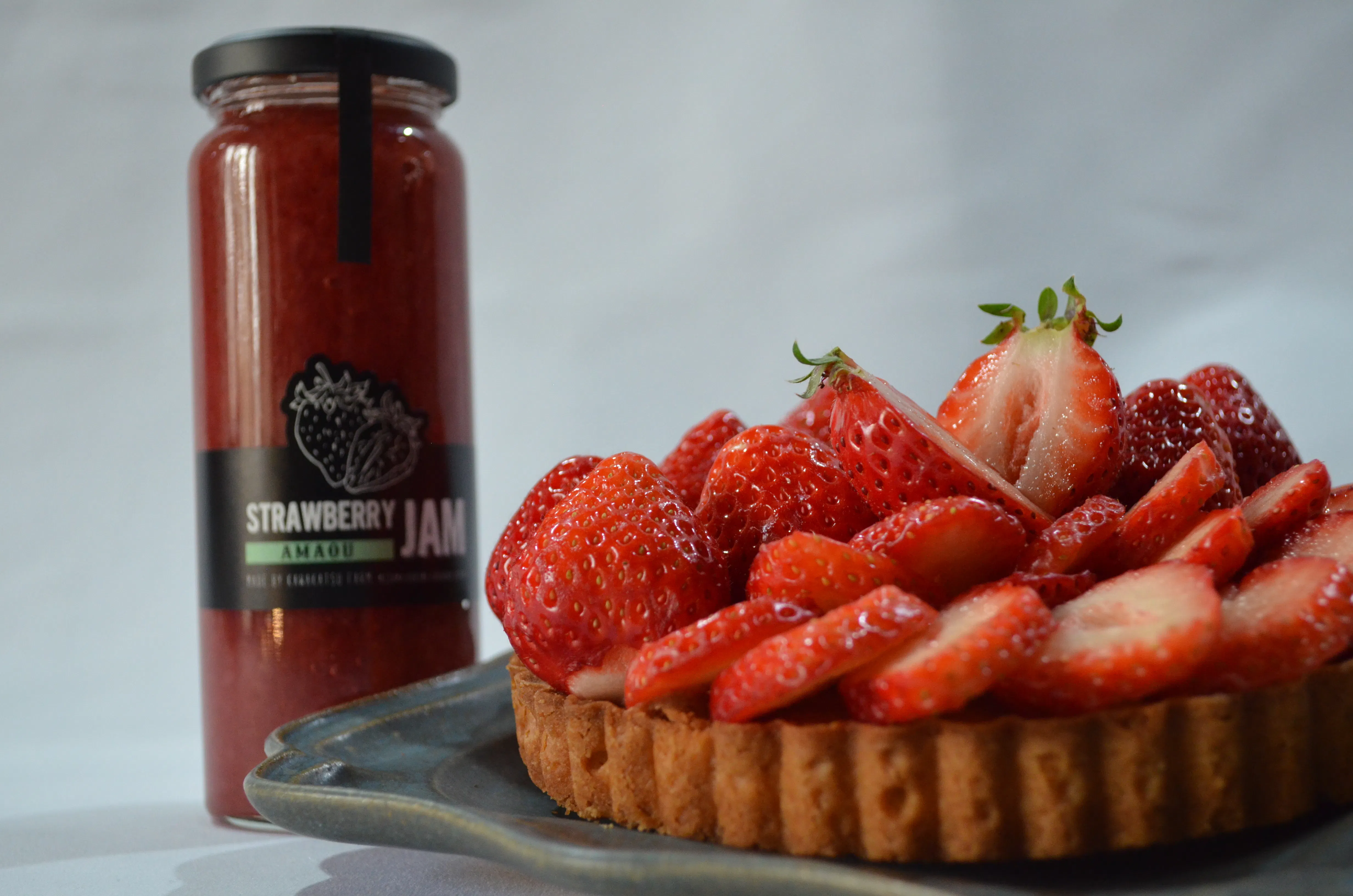福岡県の太陽をたっぷり浴びたあまおうを丁寧に煮込んだジャムは、果実そのものの濃厚な味わいが特長です。添加物を使わず、素材本来の甘さを引き出しているので、余計な味付けは不要。このジャムをタルトの仕上げにたらりと垂らすだけで、特別感のあるスイーツが完成します。