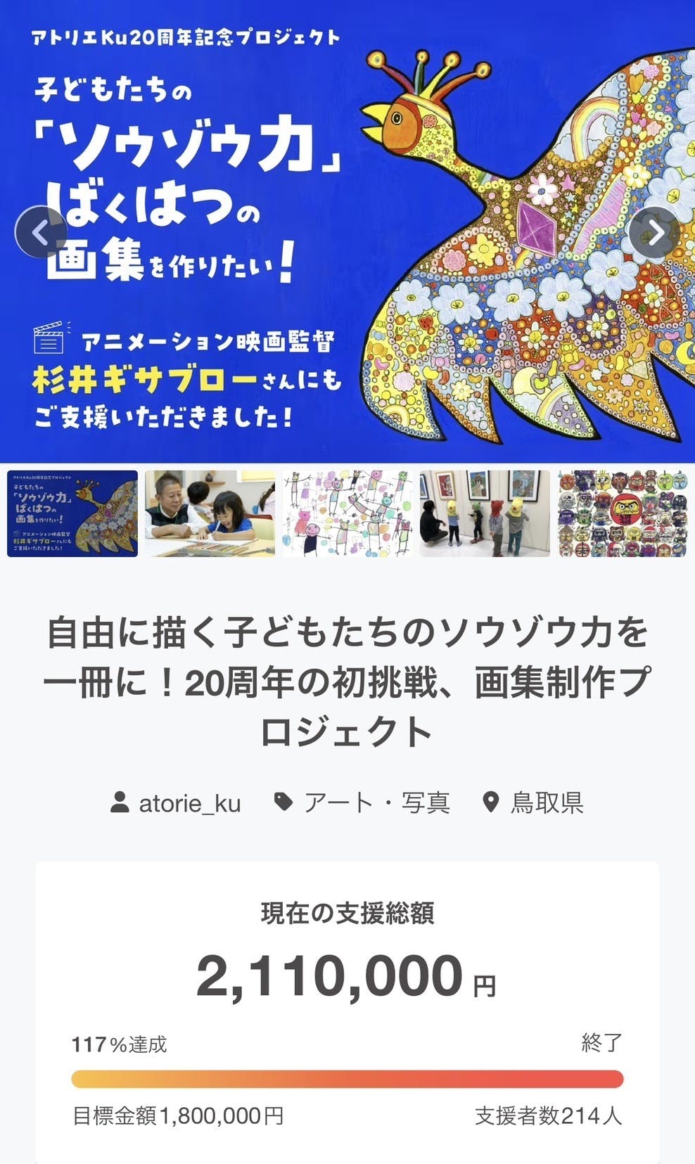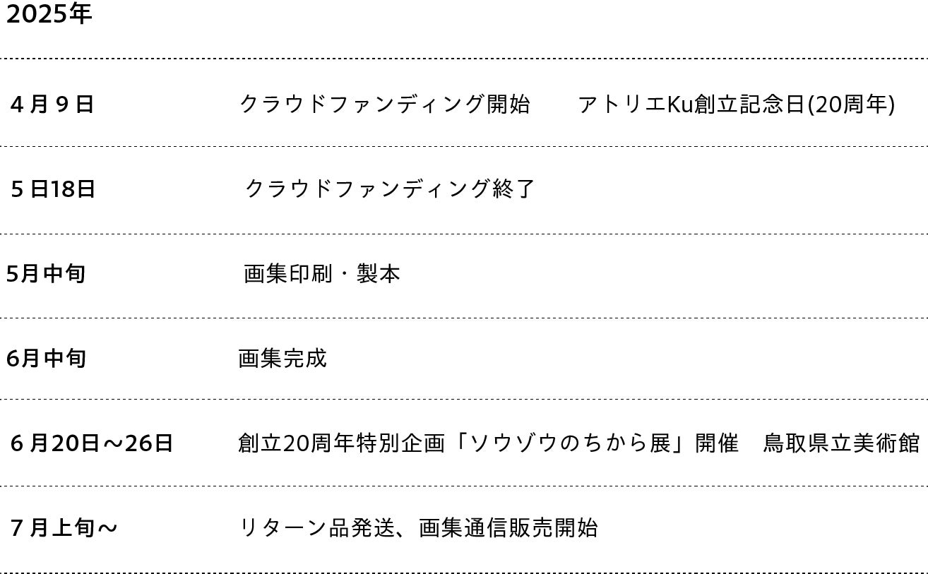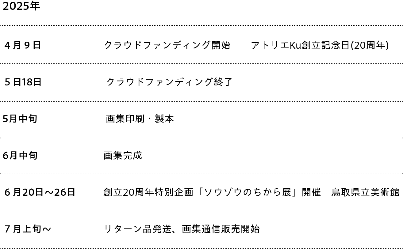 2025/05/19 20:305月18日をもって、アトリエKu20周年記念画集制作のクラウドファンディングが終了しました。214名の方からご支援をいただき、目標の117%を達成。たくさんの方のお力添えのおかげで、このプロジェクトを成功というかたちで締めくくることができました。この1か月半、たくさんのあたたかいメッセージや応援の声に励まされながら、子どもたちの“ソウゾウの力”をかたちにする挑戦を、皆さまと一緒に進めてこられたことを心よりうれしく思っています。ご支援いただいた皆さま、見守ってくださった皆さま、本当にありがとうございました!返礼品のお届けは7月を予定しております。ひとつひとつ丁寧に進めていきますので、どうぞ引き続きよろしくお願いいたします。 もっと見る