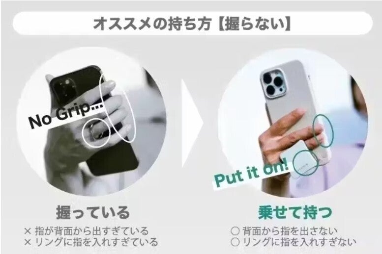 これまで親指・小指に集中しがちだった操作を、リングに指を添えることで指全体に分散。指や手首への負担を軽減し、快適なスマホ操作を実現します。