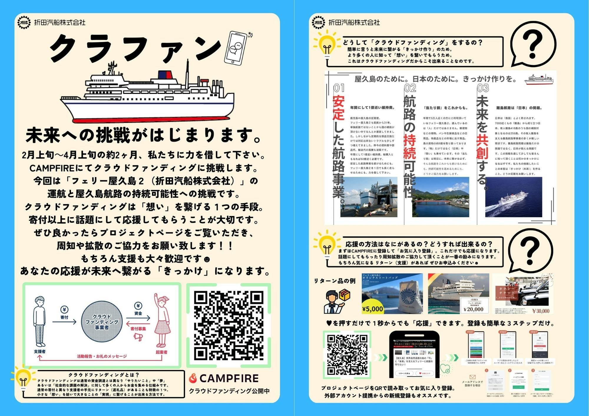また今後も活動報告・X(旧Twitter)では今回のチャレンジについての情報をお届けしております。現在、欠品中のリターン品の在庫追加や新規リターン品の追加などもこちらで発信中です。ぜひプロジェクトページのお気に入り・X(旧Twitter)のフォローもよろしくお願いします。お願いばかりで恐縮ではありますが、今後とも当プロジェクト・フェリー屋久島2の応援を何卒よろしくお願いします。