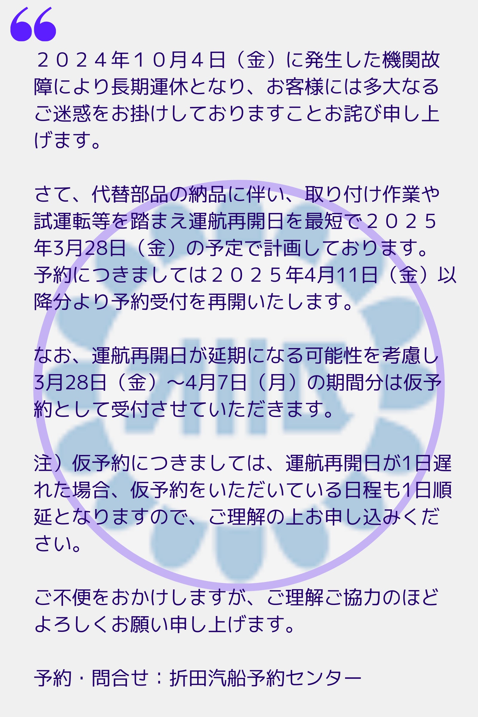 ※折田汽船株式会社HP記事より文章を引用内容と致しましては上記の通りとなりますが、