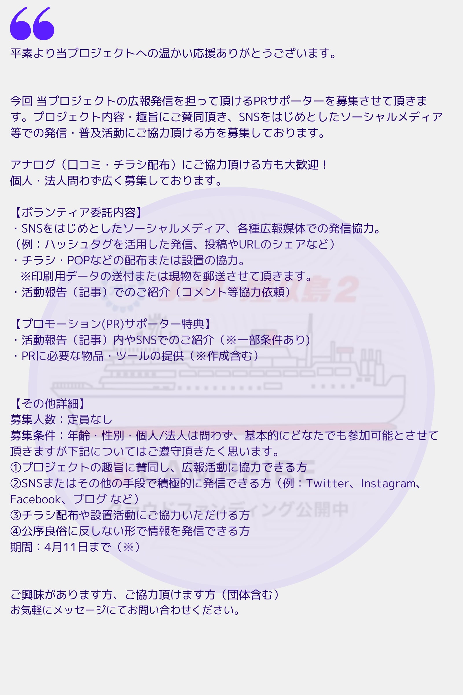 仰々しく記載してありますが SNSでのリポストなどを含めて日頃 皆様がしてくださっている応援や協力の内容をプロジェクトにおける『PRサポーター』として正式に後押しさせて頂きたいと考えております。
