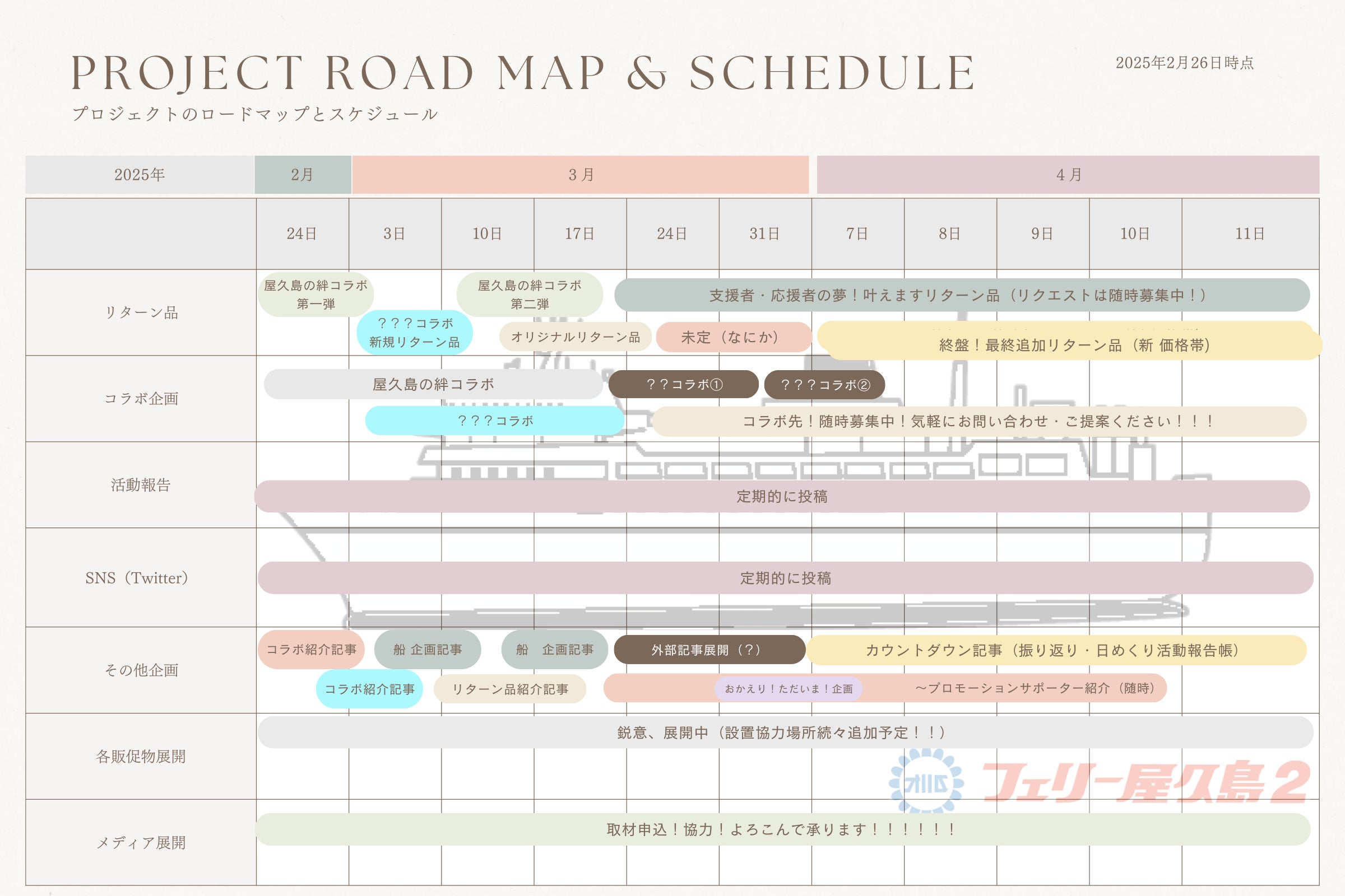 本日はプロジェクト内容(更新)と「フェリー屋久島2」についてのお知らせを掲載致します。プロジェクトの現状や、プロジェクトメンバーの想いも併せて記載させて頂きます。ぜひご覧ください。