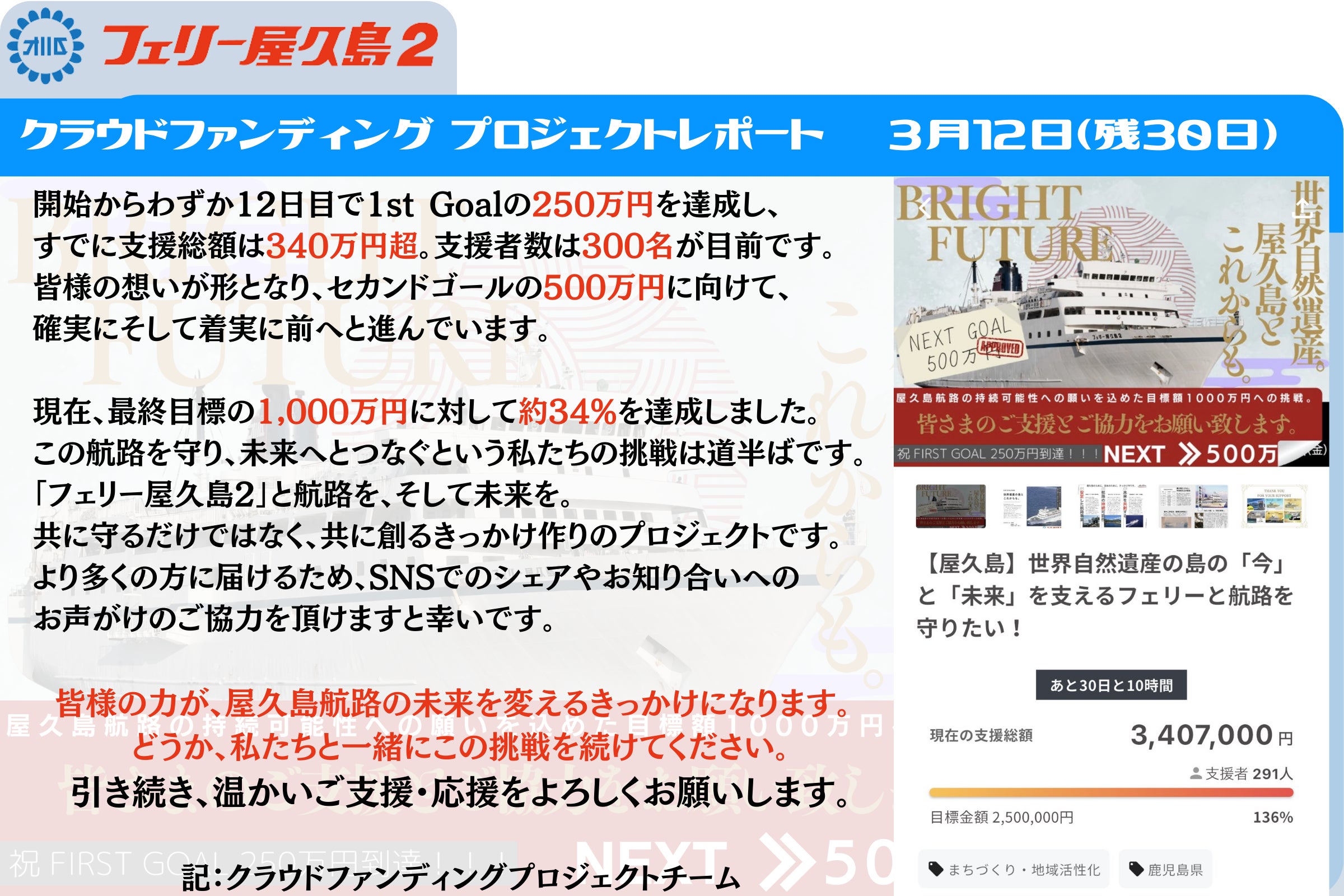 今後とも当プロジェクト、フェリー屋久島2の応援をよろしくお願いします。