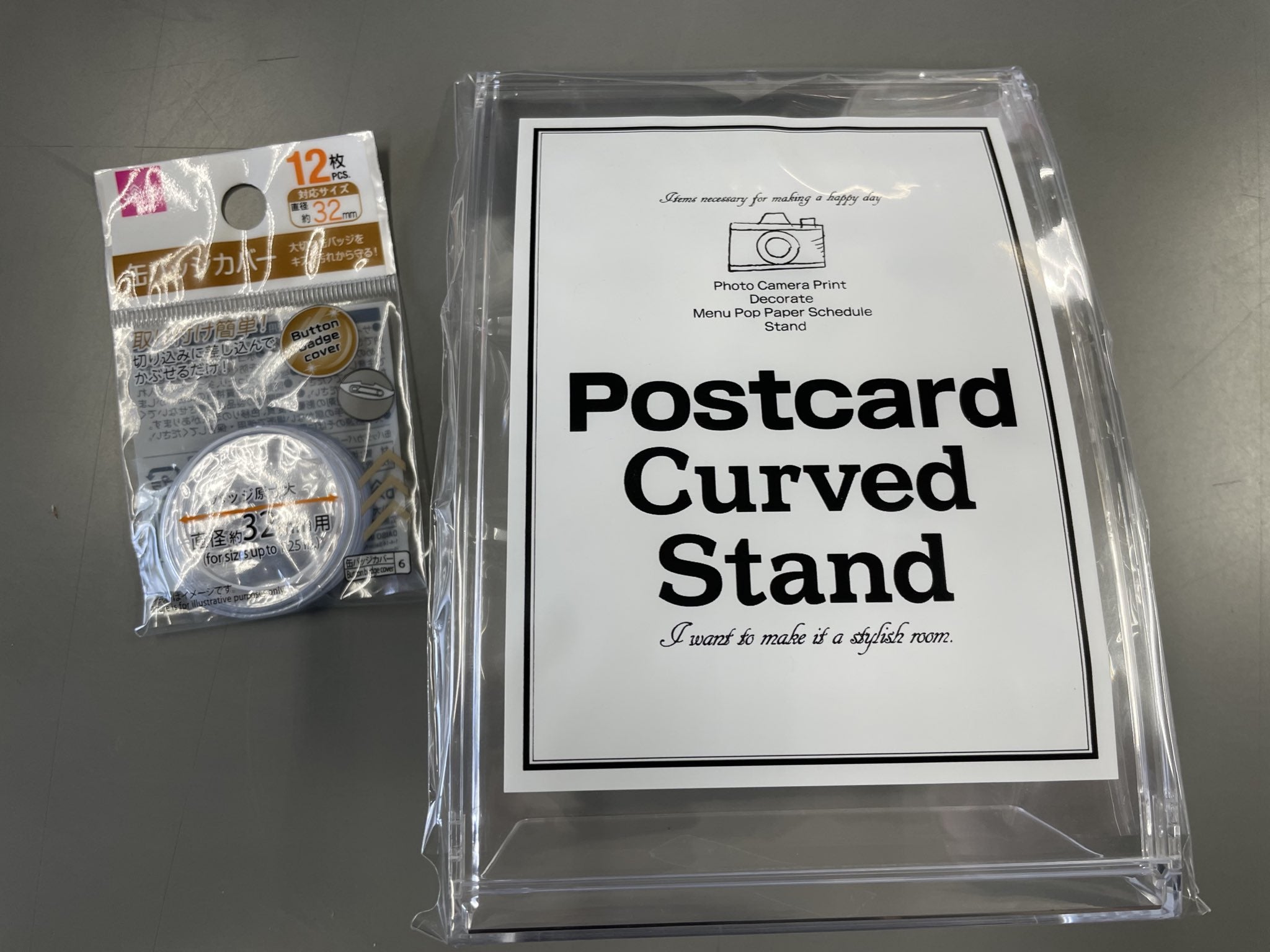 例えばこういった缶バッジカバーやポストカードスタンド(写真立てでも可)などをお買い求め頂ければ