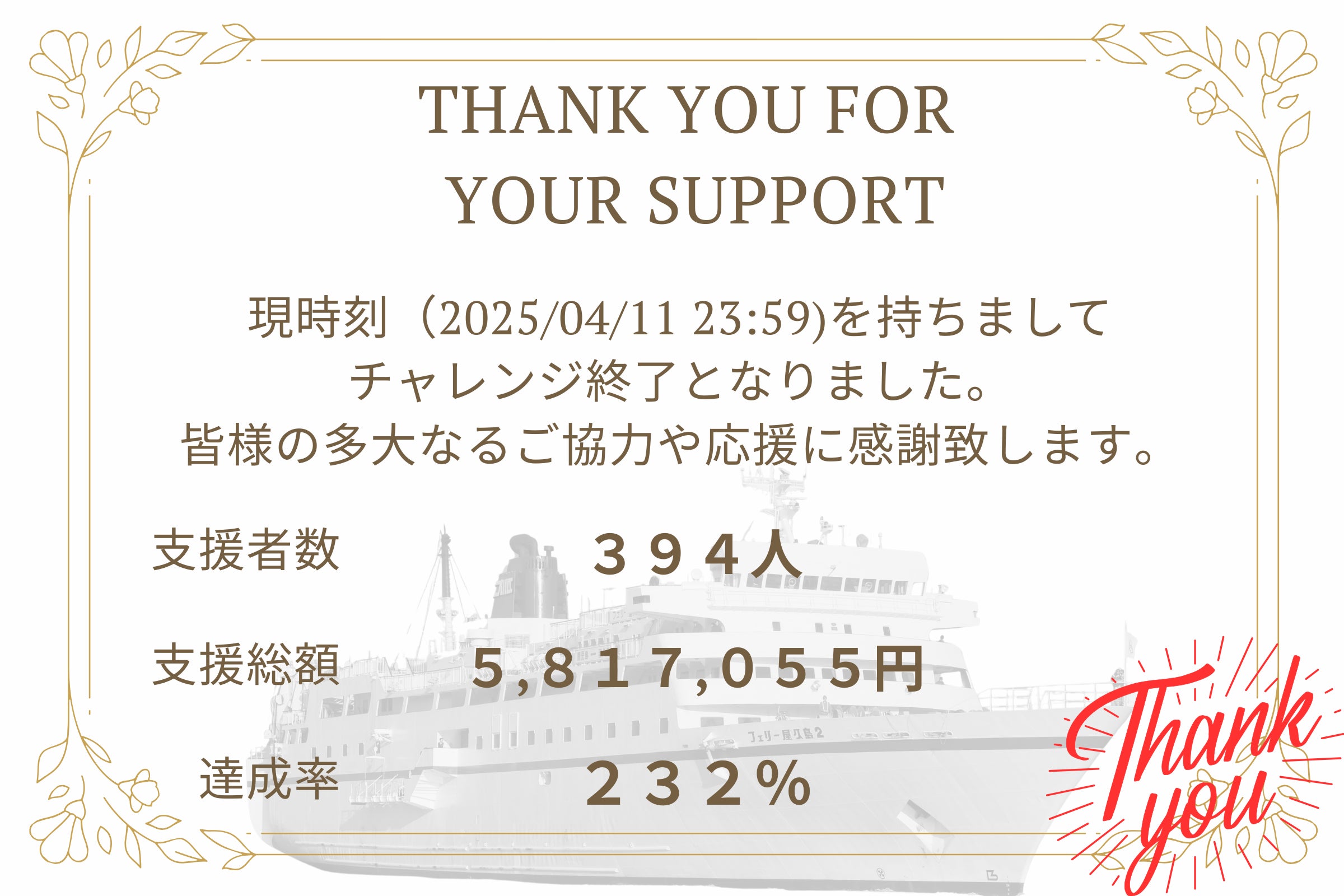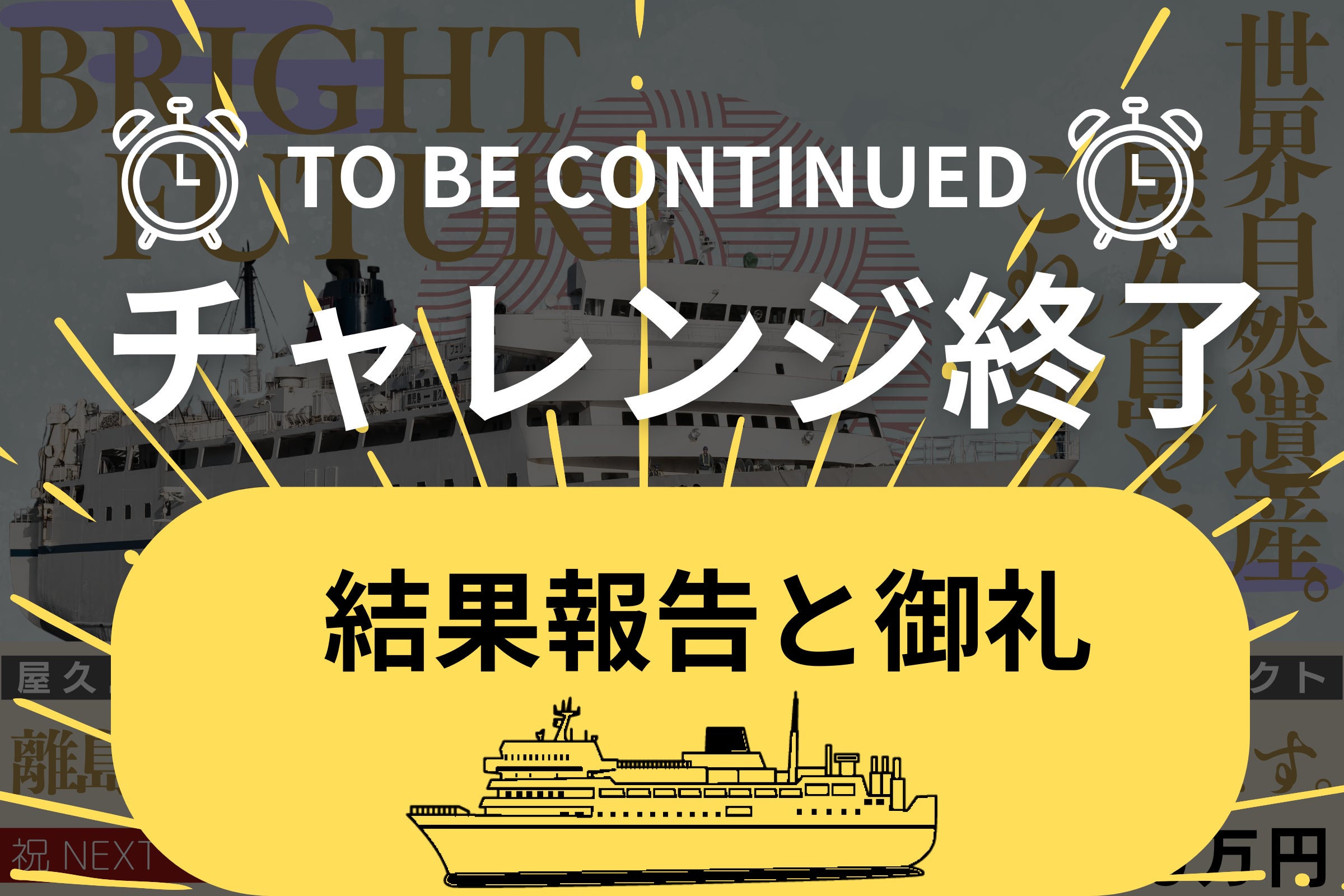 しかしながらご覧のように本当に全国各地(果ては海外)の方から応援を頂いたということもまた事実です。屋久島という鹿児島県の離島航路の問題だけではなく、全国的な課題として周知すること、先に述べたように「未来へのきっかけ作り」としては結果を残せたと感じています。また実際に支援が集まったという部分が希望となって、いずれ他の離島(船会社など)にとっての「未来」や「想い」に繋ぐことが出来るかもしれないとさえ感じました。