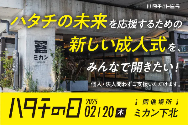2025/03/21 18:07ご支援いただいた皆さまへ、心からの感謝を申し上げます。2月20日(木)にミカン下北にて、ハタチの未来を応援するための新しい成人式「ハタチの日」を無事に開催し、多くの方にご参加いただけたことをご報告いたします!おかげさまで当日は、のべ、200名以上の方にご参加いただき、未来の一歩を踏み出すかけがえのない1日となりました。ミカン下北には社会人からの「祝辞メッセージ」、大階段にはハタチの想いが言葉にされた「マイテーマ」が一面に黄色く彩られ、ハタチ世代はもちろん、制服を着た高校生やギターケースを背負った大人たちまで足を止めてくれるなど、年齢を超えた、多くの方々が未来の想いに触れるきっかけをつくることができました。ハタチの想いが彩られた大階段メイン会場のBrooklyn下北沢での社会人を交えた「ロールモデル対談」や「座談会」をはじめとしたワークショップに加え、「未来を描くマイテーマワーク」を通し、葛藤しながらも自分と向き合い、仲間と語らう場面が見られました。イベント終了後には手にした「おごりチケット」を片手に、下北沢の街へと繰り出していく姿も見届けられました。ハタチを祝い、語り合う学生たちこのイベントが実現できたのは、ひとえに皆さまの温かいご支援があったからこそです。 本当にありがとうございました。イベントを終え、まだまだ至らない部分も感じつつ、参加した学生やキャストからのあたたかい言葉を通じて、今回の「ハタチの日」というイベントが多くの人の可能性がひらくきっかけになったことを実感しました。これからも「自分らしい未来にわくわくする瞬間」や「自分らしいファーストキャリアの選択肢」に多く出会えるようなコンテンツ作りに励んでまいります。引き続き、応援のほどよろしくお願いいたします!※オリジナルTシャツは順次発送いたします。※アフタームービーは4月12日完成を予定しております。 もっと見る