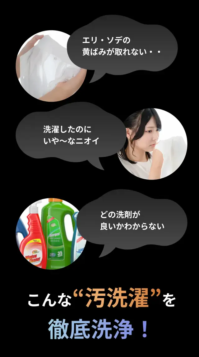 衣類に蓄積された汗や皮脂をスパークナノバブルが繊維の中から分解。長期間使用した衣類に発生する黄ばみを洗剤と結びつき、洗濯の度に衣類を白く保ちます。