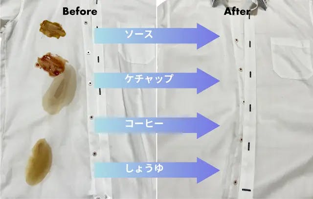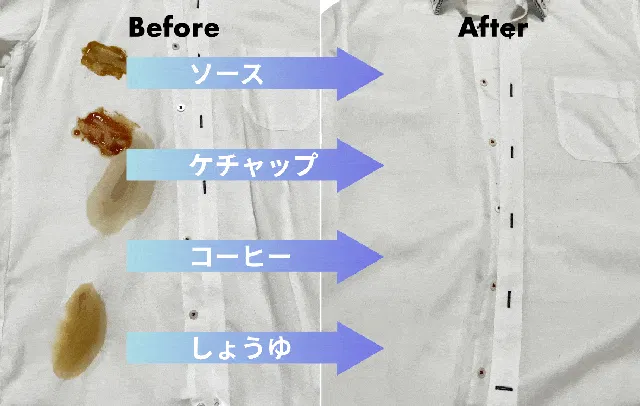 ソース・コーヒー・ワインなどの食べこぼしや飲み物のシミを分解。さらに調理中に付着する油汚れやグリースの汚れを繊維の奥まで入り込み、洗剤と結びついて分解します。