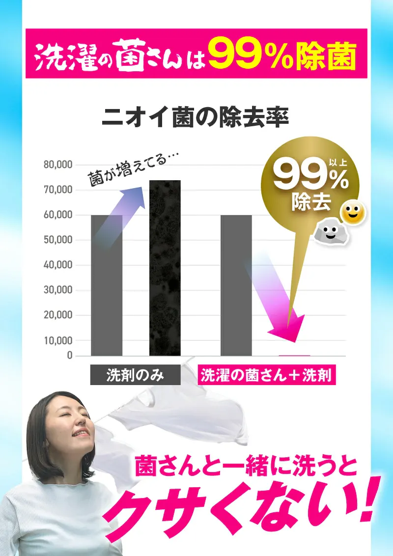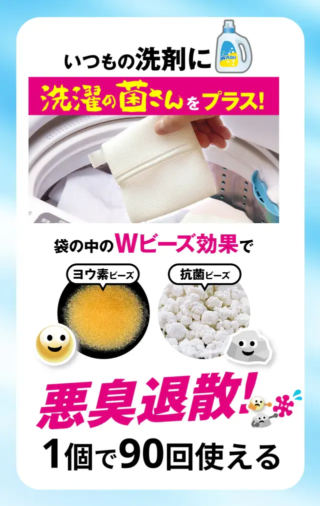 洗濯物と一緒に洗濯機に入れるだけでヨウ素の力でニオイの原因菌を99%除菌