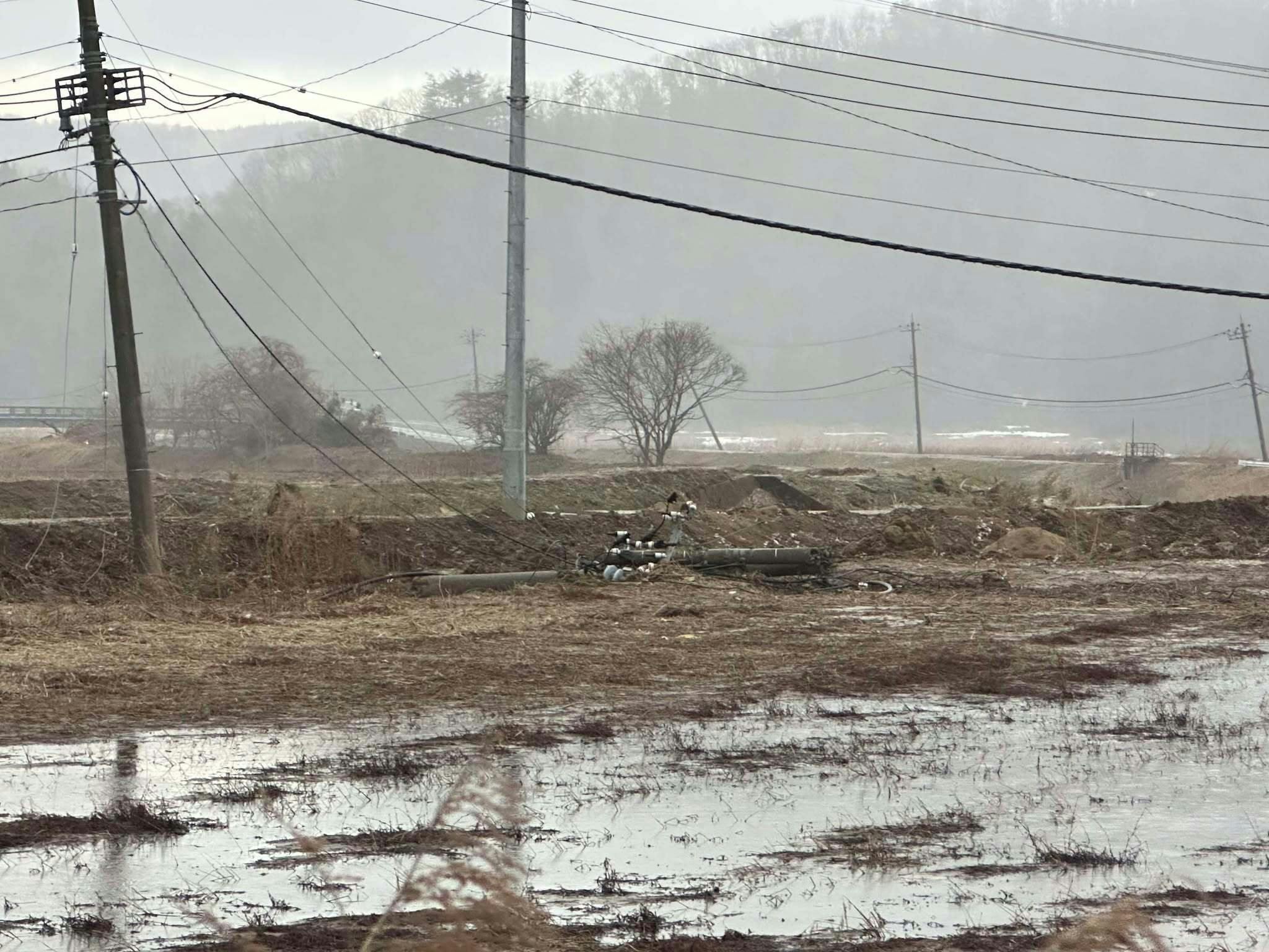 1.8m前後、人の高さほども水が襲ってきた爪痕が壁には残っていて、土砂を捨てに行った先に見える光景は一面泥だらけでおそらくは田んぼがあったであろうという感じでした。仙台空港からでも流されてきたのか、ダメになった車もちらほら。