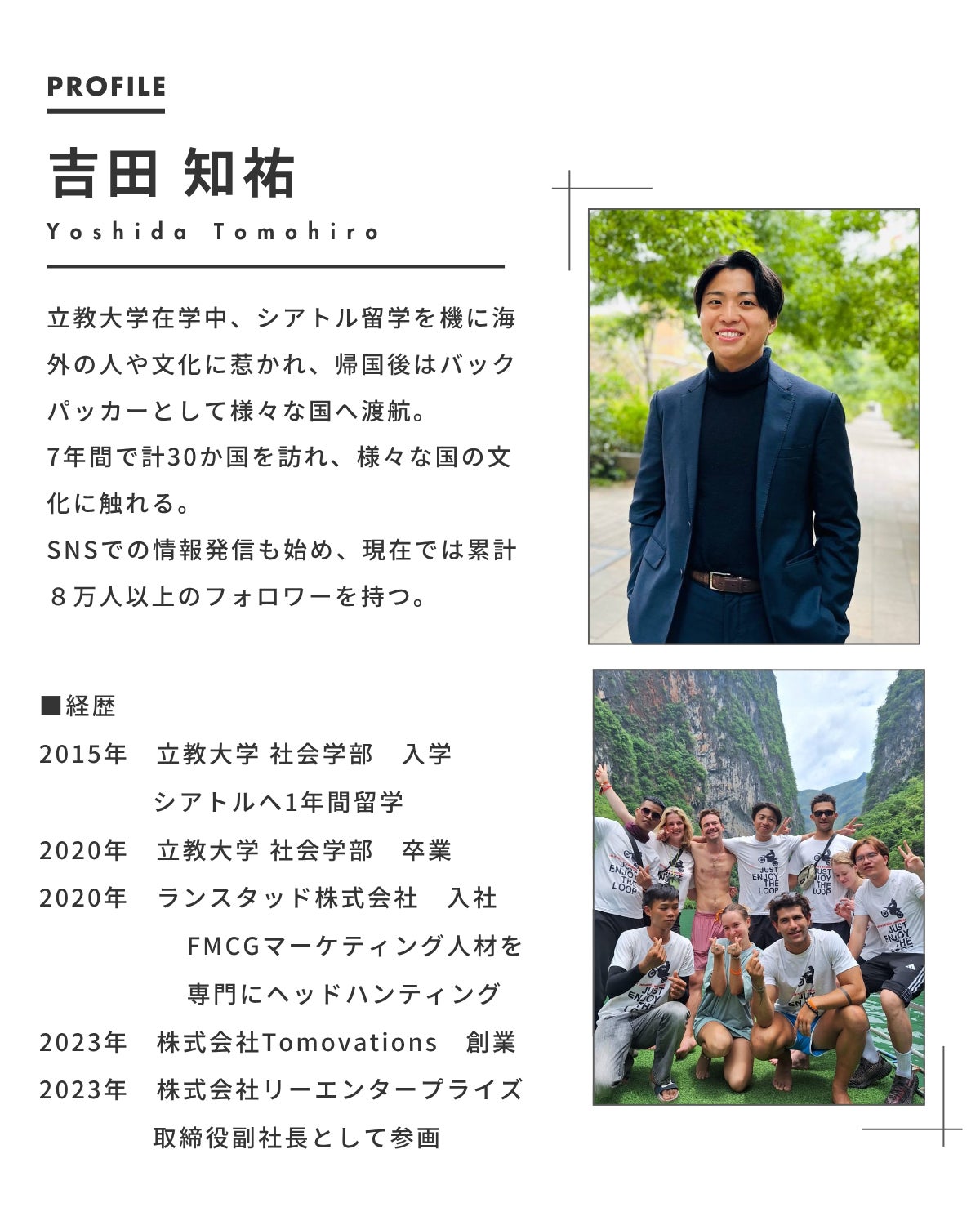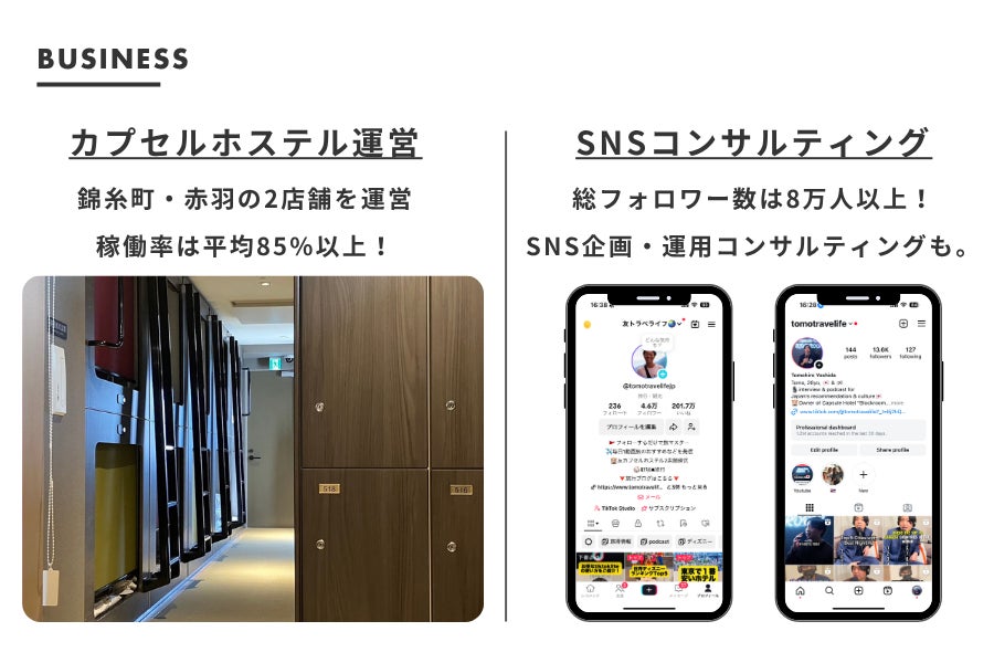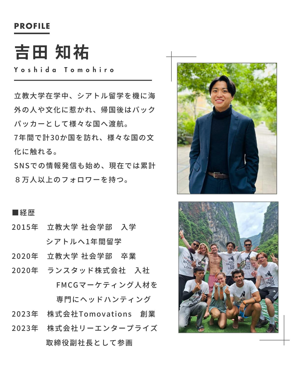 都内でカプセルホステルを2店舗運営しながら、累計8万人以上のフォロワーに向けて“旅を楽しむ方法”を発信しています、株式会社Tomovations代表・株式会社リーエンタープライズ副代表の吉田知祐です。