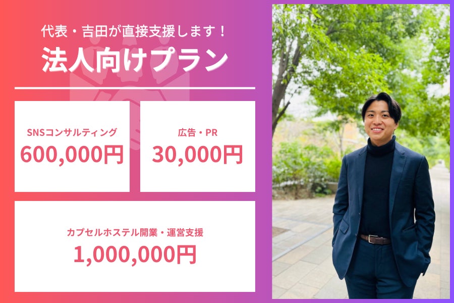 高稼働率のカプセルホステル運営や開業支援、弊社のTikTokやInstagramを活用したコンサルティング・広告宣伝を通じて貴社のビジネスをご支援いたします。