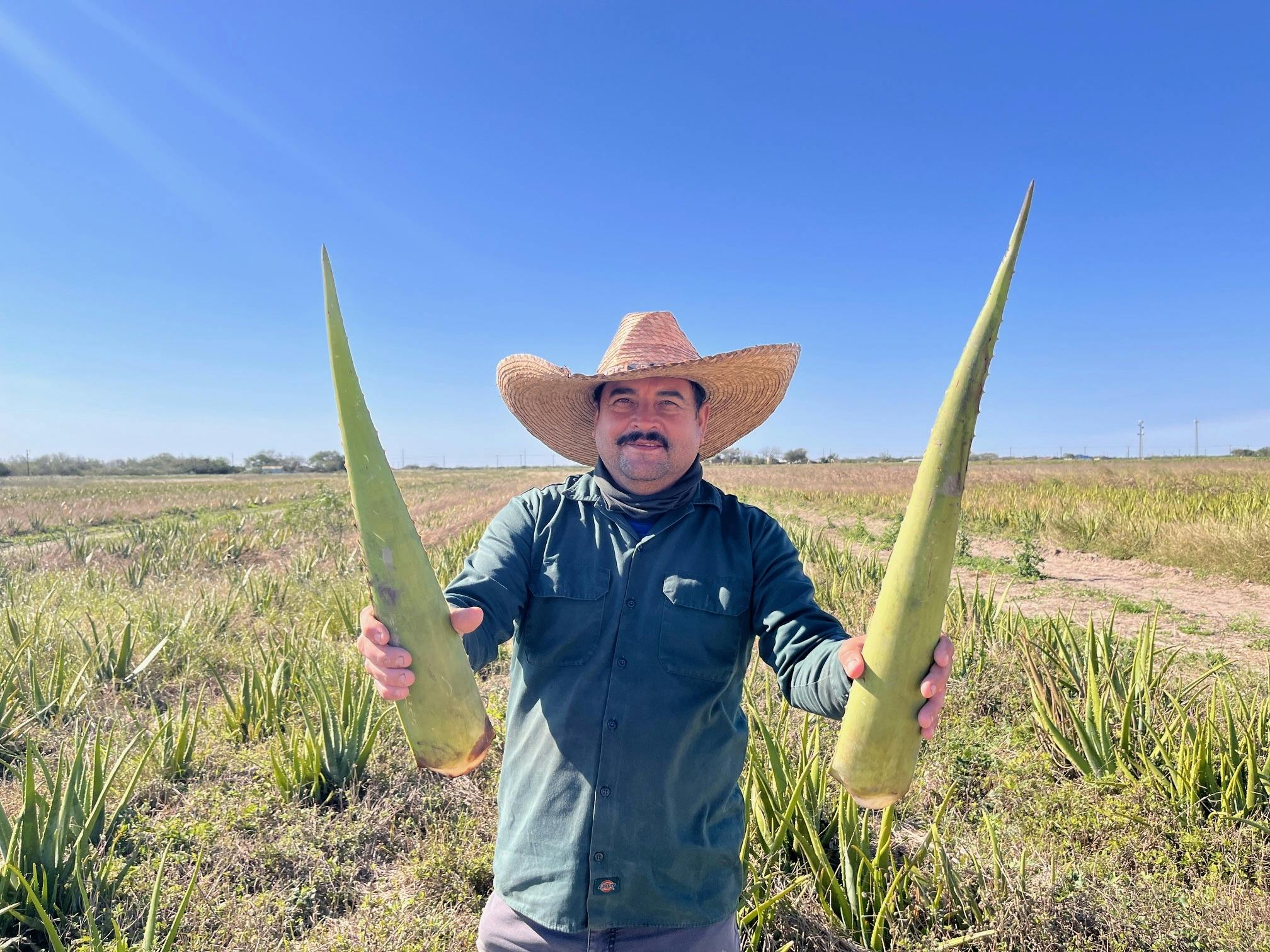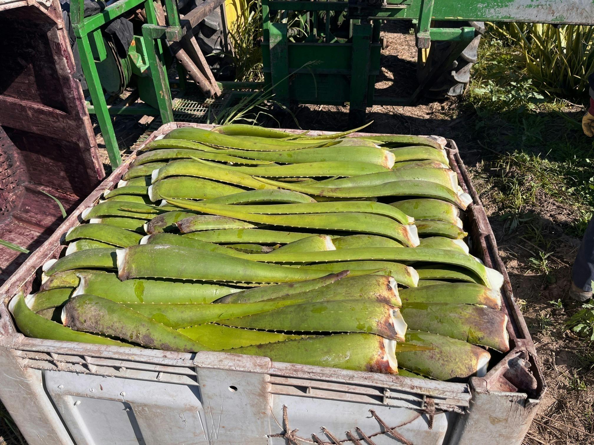 アロエベラは主に亜熱帯の気候で、強い太陽を好み、少ない水でも育つことができます。栽培は子苗を植えるところから始まりますが、収穫ができるのは1年以上経ったものです。1株からは5年近く収穫ができます。ただ機械的に刈り取りができないので、全て手作業で丁寧に行ないます。アロエベラの外皮は硬く、かつ苦みの成分が多く含まれるため、害獣や害虫の食害がなく、また病気にも強いため、無農薬で栽培されています。化学肥料もなくすくすくと大きく育ったアロエベラの葉は70~80㎝、重さは1キロを軽く超えます。
