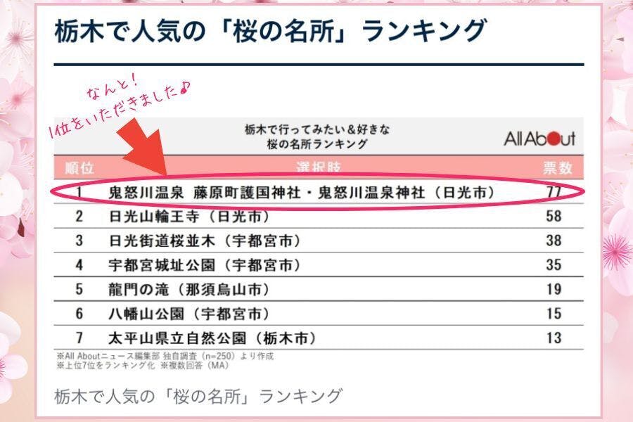 栃木の「桜の名所」ランキング1位に選ばれました!