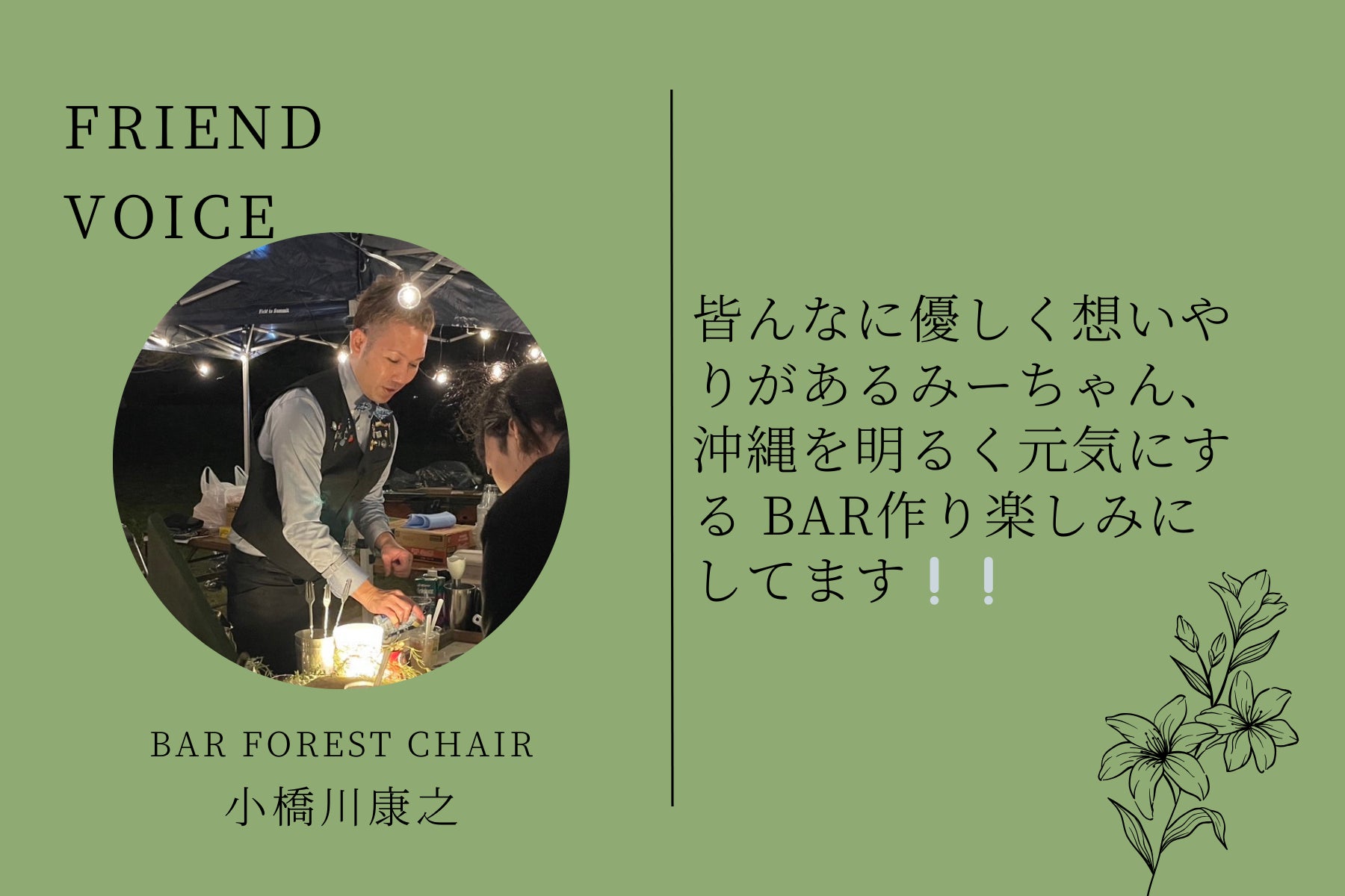 私が救われたように、みなさんにも人のつながりのあたたかさを感じてもらえる空間をこの沖縄で提供し、バーテンダーとして培った経験を活かして恩返しをしたい気持ちです。