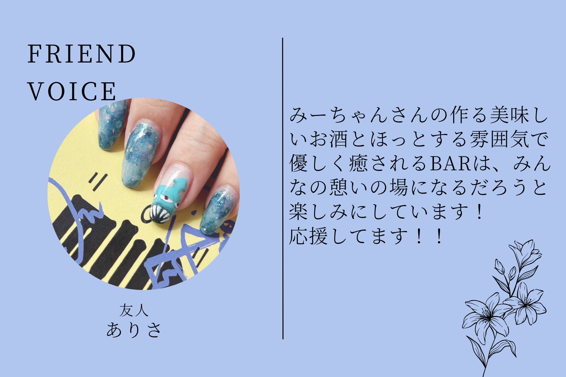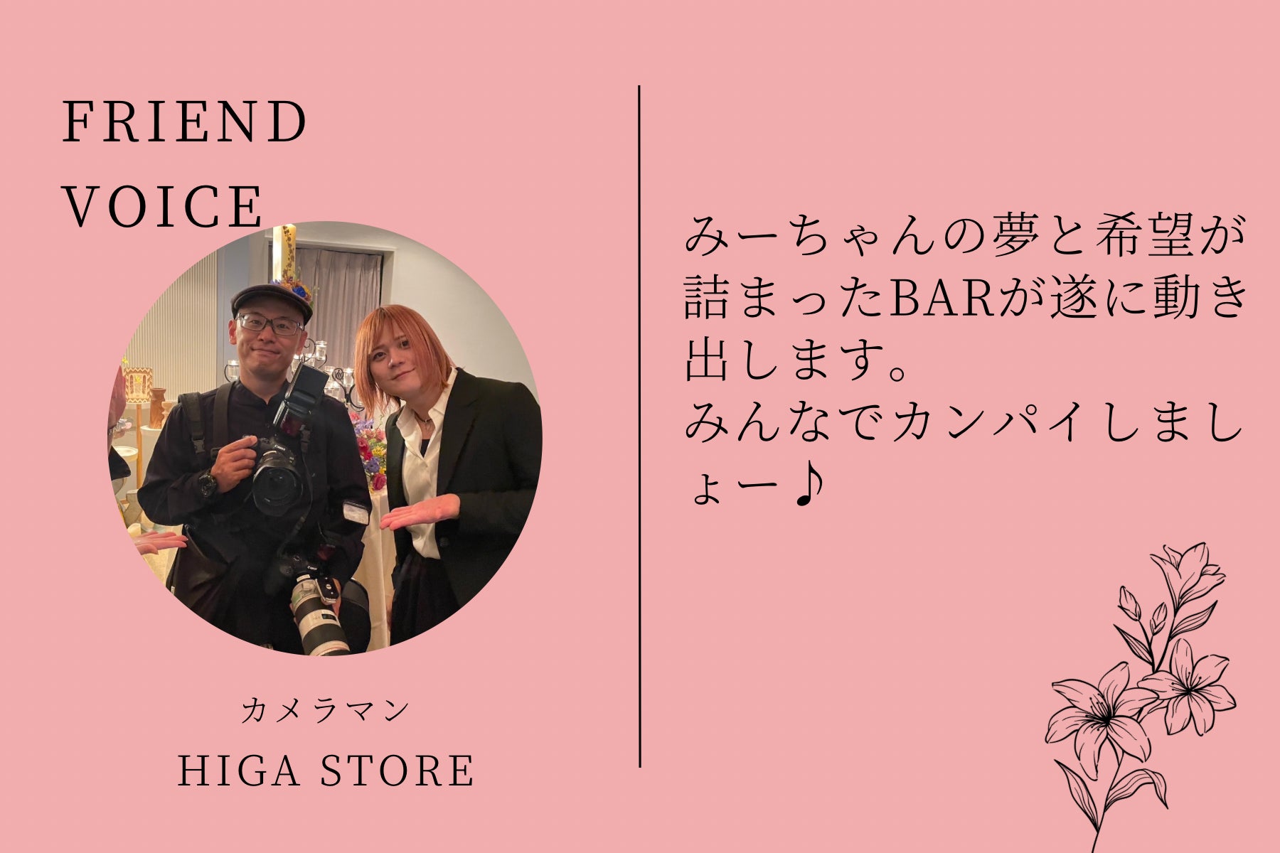 私と同じように、当たり前にBarに行くという選択肢を持っていて欲しいです。