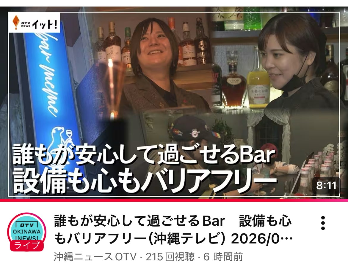 2026/03/25 16:43みなさまにお力添えいただき形になった、バリアフリーbar meme(ミーム)明日26日、夕方6時9分〜放送の『OTV Live Newsイット!』内で放送予定です。きょう夕方ニュースの最後にも明日の特集として紹介されるみたいです☺︎ぜひご覧くださいませ。 もっと見る