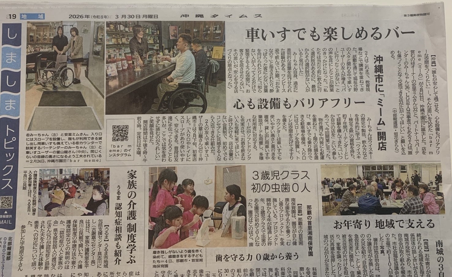 2026/03/30 19:39本日3月30日の沖縄タイムスにてバリアフリーbar meme(ミーム)掲載されています◎また今朝のRBCiラジオにても取り上げて頂きました。リンクからの再生で放送シーンに飛べます◎ぜひチェックしてもらえると嬉しいです。アップ!! RBCiラジオ 2026/3/30(月) 06:55-09:50 https://radiko.jp/share/?t=20260330072026&sid=RBC もっと見る