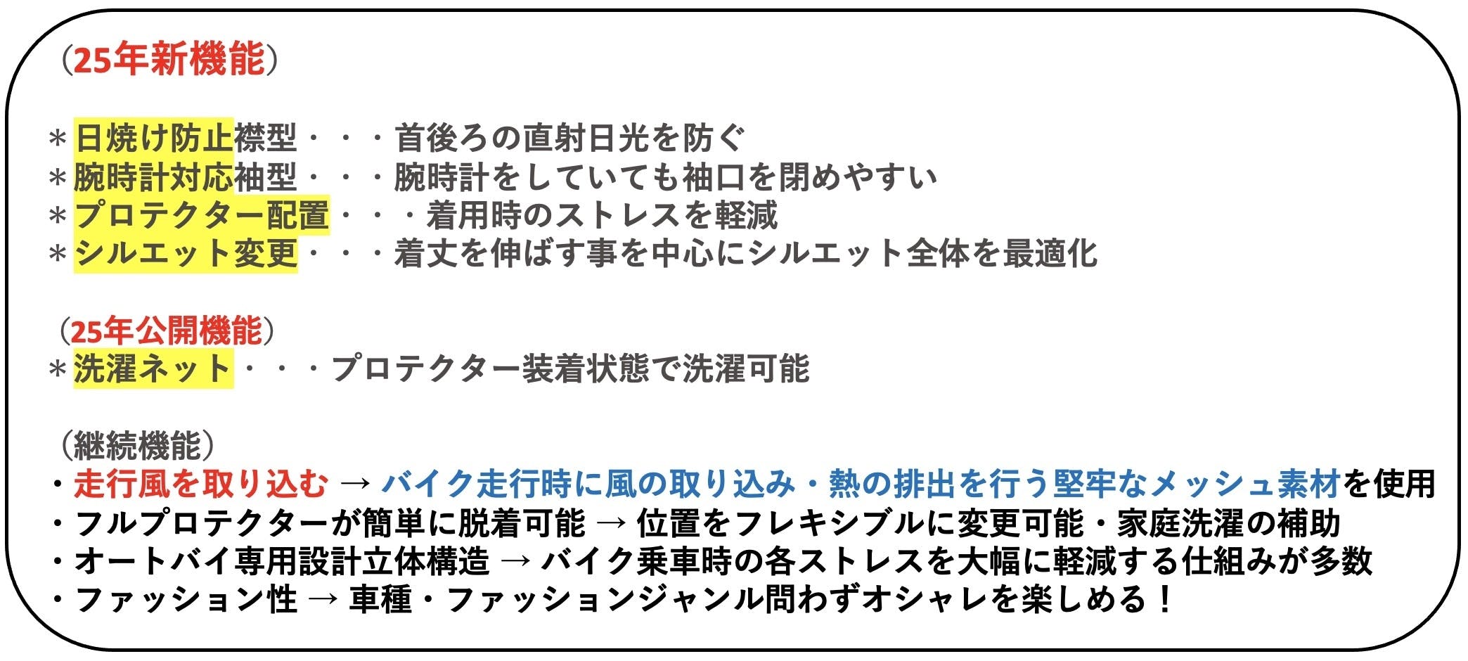 2025年モデルは24年版ユーザーのご意見をもとに走行風取り込みは保持し実用的モデルチェンジを行いました。夏のバイクライフで毎回着用するものだから実用性向上が必要だと考えています。そして夏のライダーの皆様には納得して頂けるものだと自負しております(笑)