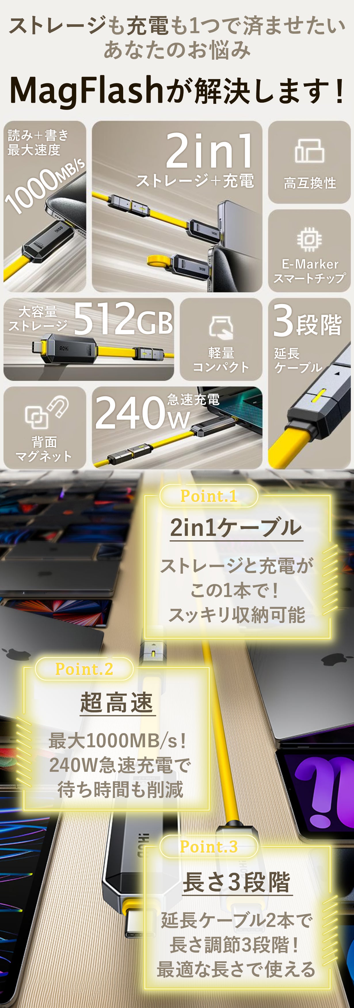 MagFlashはストレージと充電ケーブルを両立させる革新的な2-in-1ケーブルセットです!